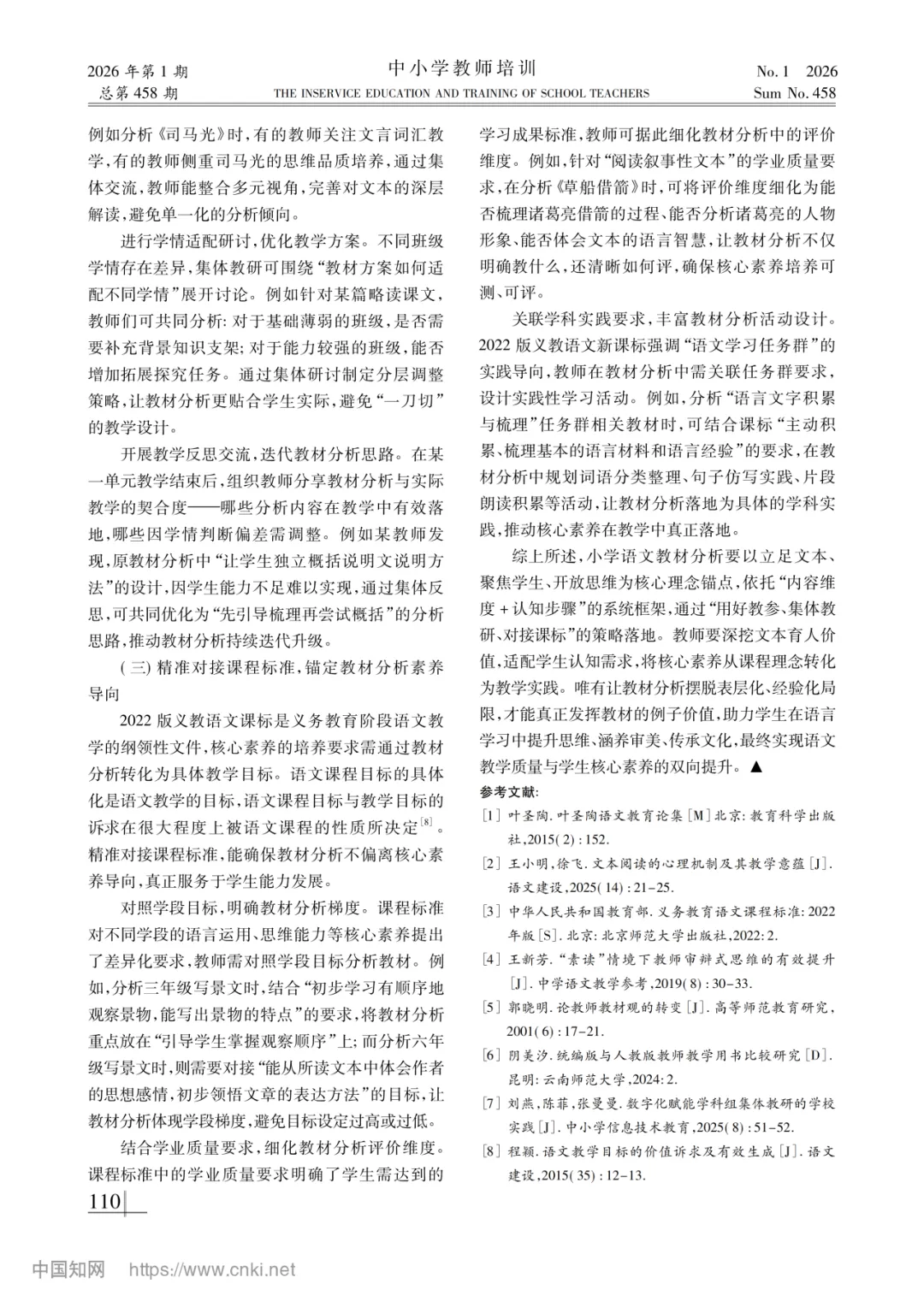 综上所述,小学语文教材分析要以立足文本、聚焦学生、开放思维为核心理念锚点,依托“内容维度+认知步骤”的系统框架,通过“用好教参、集体教研、对接课标”的策略落地。教师要深挖文本育人价值,适配学生认知需求,将核心素养从课程理念转化为教学实践。唯有让教材分析摆脱表层化、经验化局限,才能真正发挥教材的例子价值,助力学生在语言学习中提升思维、涵养审美、传承文化,最终实现语文教学质量与学生核心素养的双向提升。