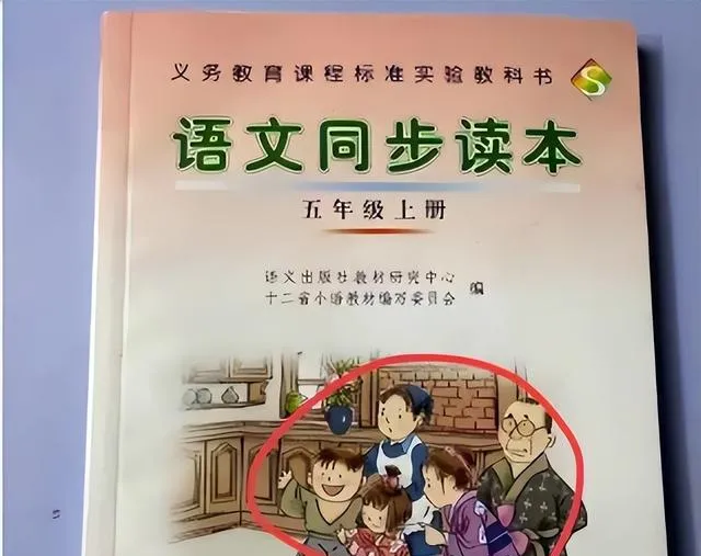 最后一个,图中这本五年级语文同步读本,封面画着一家人其乐融融的样子,可打眼一看,三个人穿的是和服,明明写着“中华故事”,只有角落里那个人像保姆没穿和服,到底在表现啥,谁也说不准,这种细节不是小事,大人瞅两眼觉得怪,小孩只会觉得“好看”,慢慢混淆了本该分清楚的边界。