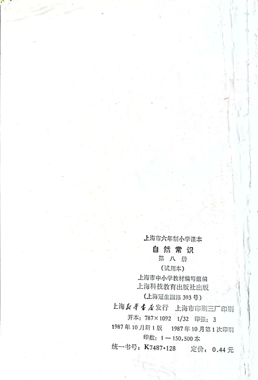 >上海市六年制小学课本(试用本)自然常识·第八册[上海教育出版社·1987年10月新一版一印]