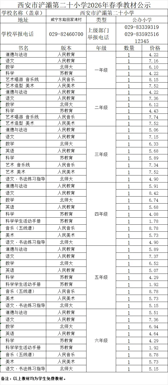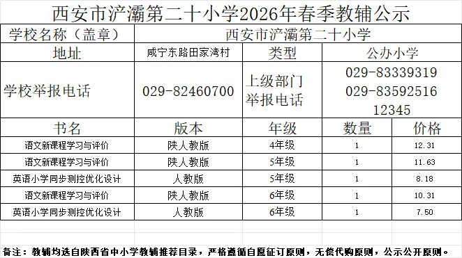 现将我校2026年春季学期教材征订及教辅材料评议结果予以公示,接受家长和社会各界监督。公示期为7个工作日,公示期间如有异议,可向西安市浐灞第二十小学反映,联系电话:029-82460700(工作日受理)。