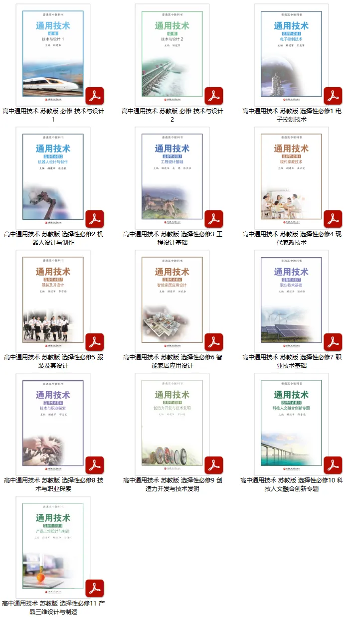 高中通用技术苏教版教材包括必修2册,选择性必修11册,共13册。