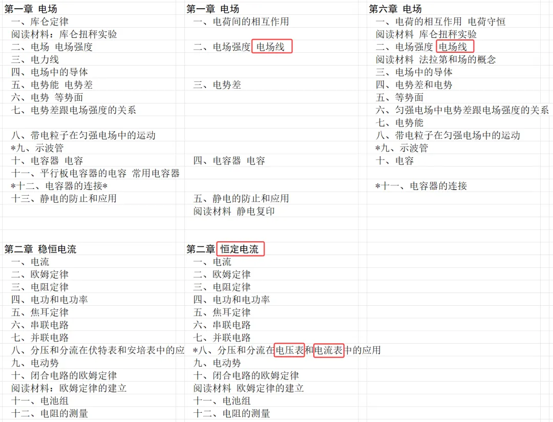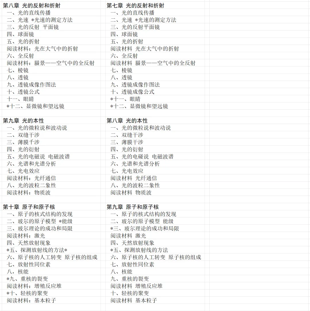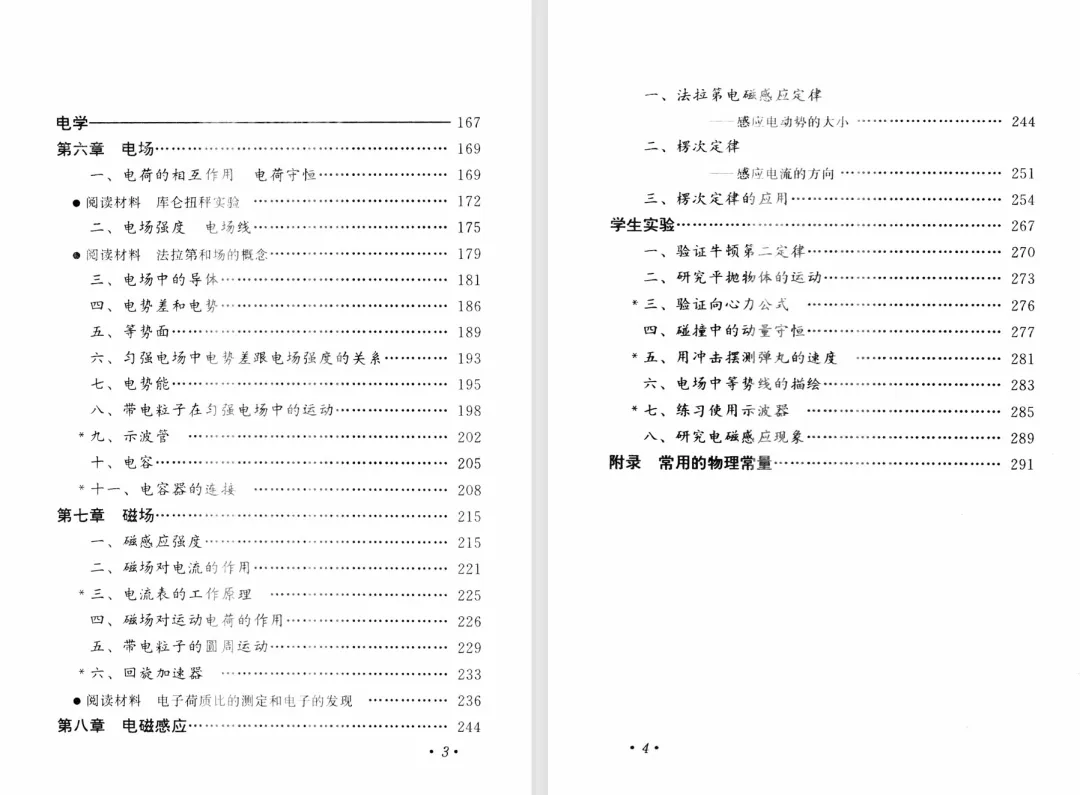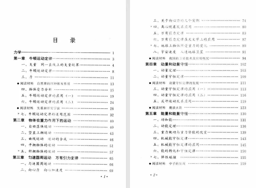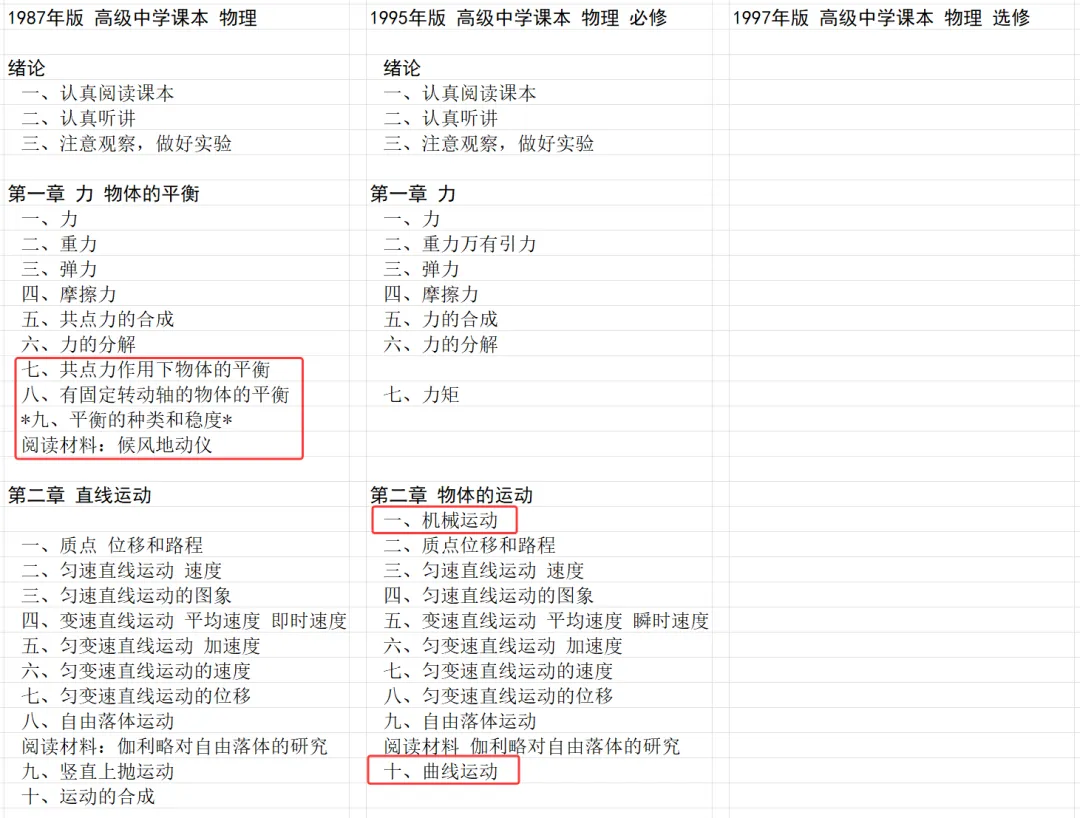 本文对九十年代初人民教育出版社出版的 高级中学课本 物理 进行总体介绍的文章进行补充和修正。补充和修正的文字内容标蓝。这套教材第一册和第二册封面风格相同,第三册封面风格与前两册不同。根据《人民教育出版社书目(1950~1999)教材卷》(简称《书目 教材卷》)的介绍,这套高中物理教材的三册都出了两个版本,第1版在1990年和1991年出版,第2版在1995年和1997年出版。九十年代初 高级中学课本 物理 官方回顾中提到,《新中国中小学教材建设史 1949-2000 研究丛书 物理卷》(简称《物理教材建设史》)一书指出,1992年印刷时,必修两册补充了《高中物理课外习题集》中的习题,放在书末尾,没有修改版次。下面是这套高中物理教材第一册和第二册第二版的说明。第2版主要调整了一些物理量的名称和单位。合理推断应该是第2版才把简谐振动、电力线、稳恒电流、磁力线等概念改名为简谐运动、电场线、恒定电流、磁感线等。所以,这套高中物理教材事实上有三个版本:第1版初版、第1版增加课外习题的版本、第2版。《物理教材建设史》没有提到第2版。与 1987年版 高级中学课本 物理(高中物理乙种本第2版)进行对比这套九十年代初的高中物理是在1987年版高中物理(高中物理乙种本第2版)的基础上编写的,接下来就对两个版本教材的目录进行详细对比。由于乙种本和乙种本第2版在目录上差别不大,本文以高中物理乙种本简称乙种本第2版。先从章级别对比高中物理乙种本和这套高中物理。下面的表格对不同版本教材各册各章进行了展示。第一列是乙种本,第二列是这套教材的必修两册,第三列是这套教材的选修一册。可以看出,这套高中物理必修第一册和第二册的内容大体上分别对应乙种本上册和下册的内容,但是内容有所精简。被精简掉的内容放到了选修的第三册里。这套高中物理教材,必修和选修有有同名的章,说明这些模块的内容被拆分了。被精简拆分到选修的内容,显然是高中物理中比较难的内容。下面对高中物理乙种本和这套高中物理教材的目录进行逐章逐小节的对比。后面表格中的三列内容分别为乙种本、这套高中物理必修和这套高中物理选修。先看教材开头的部分。这套物理在必修第一册第一章 力删除了物体的平衡、有固定转轴的物体的平衡等小结和阅读材料,仅保留力矩的小节。事实上力矩这节里面有讲有固定转动轴的物体的平衡。在第二章的章名从直线运动改为物体的运动。这套教材第二章开头增加了机械运动的概念,这些内容在甲种本中有,在乙种本没有。第二章末尾删去了竖直上抛运动和运动的合成,代以介绍曲线运动。接下来看力学的重点内容的对比,如下表所示。这套教材必修仅保留了牛顿运动定律,删除了动量、曲线运动和万有引力定律的大部分内容。而且牛顿运动定律还在选修部分重复出现。选修第一章第一节回顾矢量,还专门介绍同一直线上的矢量运算,甲种本中这项内容独占一节。这章第四节专门介绍物体的受力分析,后面还有两个小节介绍牛顿运动定律的应用,甲种本也有类似的两个小节。选修第二章专门介绍物体在重力作用下的运动,第一节回顾必修第二章已经讲过的自由落体运动。选修第三章第七节介绍地球上物体所受重力的变化,这节在甲种本有,乙种本没有。选修第四章单独介绍动量和动量守恒,内容比乙种本要多一些。这套物理教材必修中机械能这章,在选修中进行再次学习,内容扩宽加深,选修中有弹性碰撞,这项内容在乙种本没详细讲,在甲种本有。这套教材的机械振动和机械波全部在必修部分,内容与乙种本相同。这套教材把简谐振动改名为简谐运动。力学部分结束了,下面进行简单的小结。第一,这套教材的必修部分将力学中较难的受力分析、运动定律、直线运动、曲线运动、万有引力、动量、机械能等较难的内容放在选修,必修仅保留最基础的内容。第二,这套教材的选修部分做了一些加强,增加了一些原来在甲种本有乙种本没有的内容,动量、机械能、碰撞等内容的篇幅比乙种本多一些,所以这套教材选修的力学部分比较接近甲种本。第三,这套教材删除了物体的平衡,这是让我觉得比较奇怪的。下面对比热学部分。这套教材的热学内容和乙种本基本相同。这套教材把分子运动论改名为分子动理论。接下来进入乙种本下册和这套教材必修的第二册。看电学部分。这套教材必修部分的电场内容非常少,选修中的电场内容较多。整体上看,这套教材必修和选修中电场内容的总和与乙种本相当。这套教材把电力线改名为电场线。乙种本中的静电复印在这套教材被单列出来放在了阅读材料。接下来第二章,这套教材把稳恒电流改名为恒定电流。把伏特表和安培表分别改名为电压表和电流表。恒定电流在这版教材仅出现在必修部分,内容与乙种本相当。本套教材磁场和电磁感应的内容和电场比较类似,内容被分散在必修和选修中,必修部分内容较少,必修与选修的内容总和与乙种本相当。接下来看电学剩余的章节,这些内容仅出现在这套教材的必修中。这套教材将交流电的章名修改为交变电流,删除了纯电感电路和纯电容电路的小节,还删除了直流输电的阅读材料。乙种本中比较完整的电子技术基础的内容,仅留下晶体管的极少和简单的收音机的原理,合并到电磁振荡和电磁波一章。最后是光