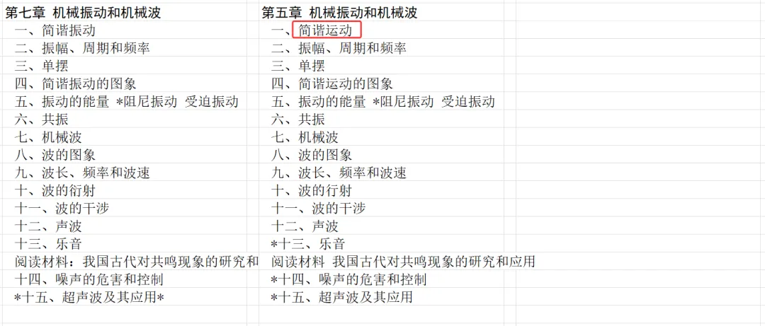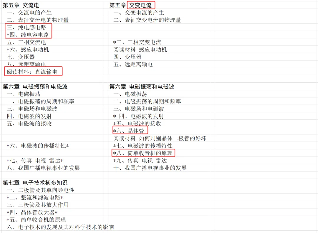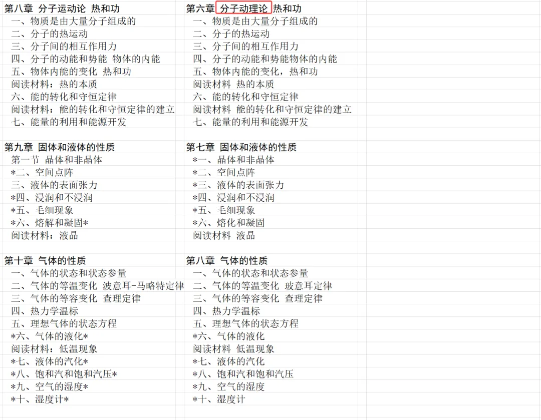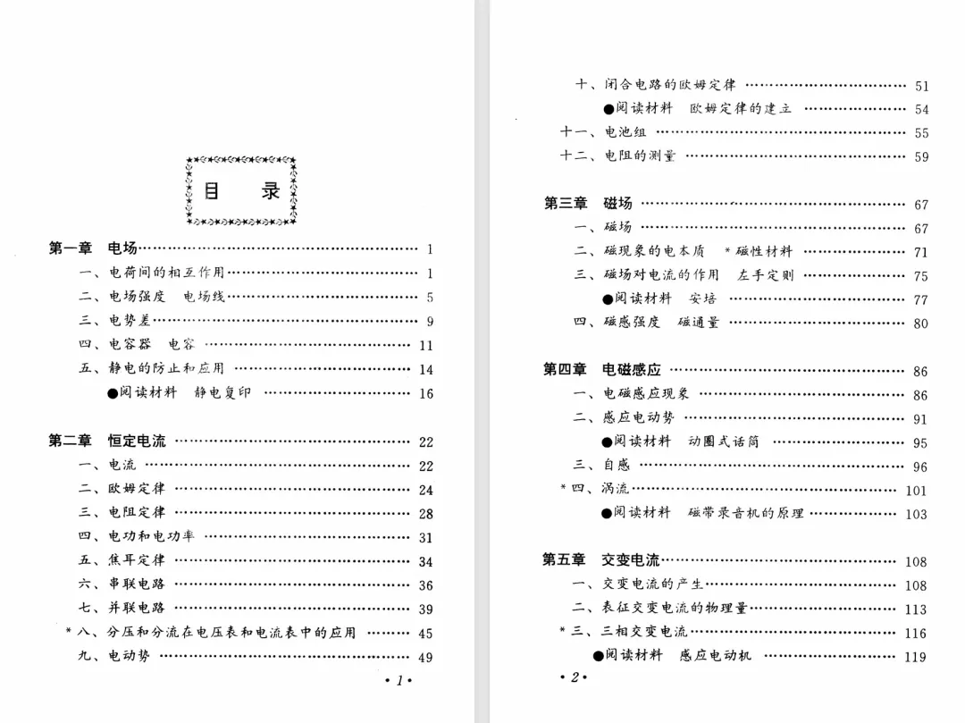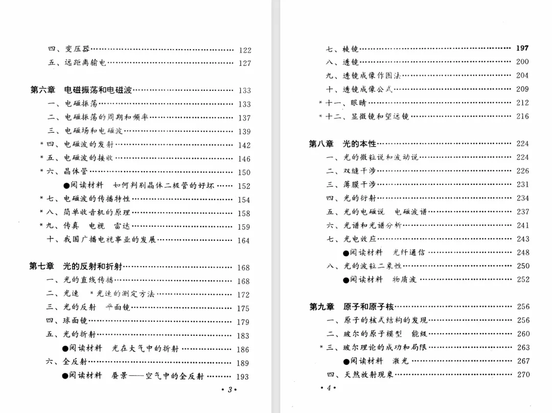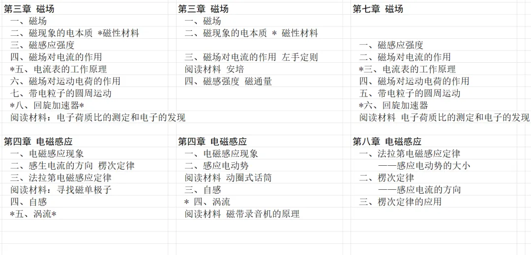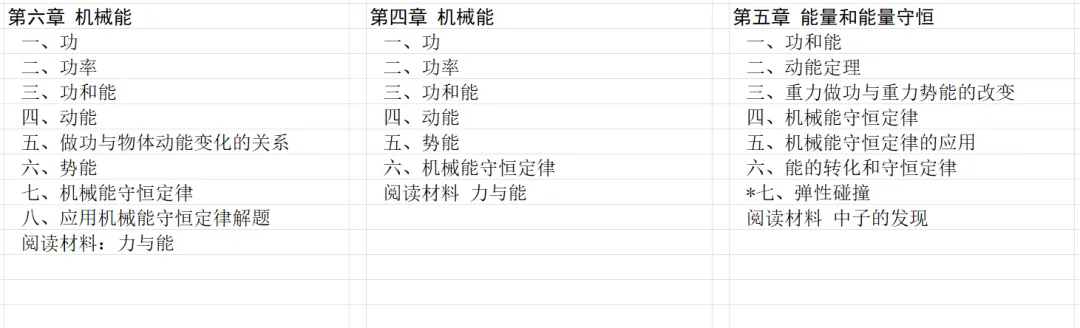 本文对九十年代初人民教育出版社出版的 高级中学课本 物理 进行总体介绍的文章进行补充和修正。补充和修正的文字内容标蓝。这套教材第一册和第二册封面风格相同,第三册封面风格与前两册不同。根据《人民教育出版社书目(1950~1999)教材卷》(简称《书目 教材卷》)的介绍,这套高中物理教材的三册都出了两个版本,第1版在1990年和1991年出版,第2版在1995年和1997年出版。九十年代初 高级中学课本 物理 官方回顾中提到,《新中国中小学教材建设史 1949-2000 研究丛书 物理卷》(简称《物理教材建设史》)一书指出,1992年印刷时,必修两册补充了《高中物理课外习题集》中的习题,放在书末尾,没有修改版次。下面是这套高中物理教材第一册和第二册第二版的说明。第2版主要调整了一些物理量的名称和单位。合理推断应该是第2版才把简谐振动、电力线、稳恒电流、磁力线等概念改名为简谐运动、电场线、恒定电流、磁感线等。所以,这套高中物理教材事实上有三个版本:第1版初版、第1版增加课外习题的版本、第2版。《物理教材建设史》没有提到第2版。与 1987年版 高级中学课本 物理(高中物理乙种本第2版)进行对比这套九十年代初的高中物理是在1987年版高中物理(高中物理乙种本第2版)的基础上编写的,接下来就对两个版本教材的目录进行详细对比。由于乙种本和乙种本第2版在目录上差别不大,本文以高中物理乙种本简称乙种本第2版。先从章级别对比高中物理乙种本和这套高中物理。下面的表格对不同版本教材各册各章进行了展示。第一列是乙种本,第二列是这套教材的必修两册,第三列是这套教材的选修一册。可以看出,这套高中物理必修第一册和第二册的内容大体上分别对应乙种本上册和下册的内容,但是内容有所精简。被精简掉的内容放到了选修的第三册里。这套高中物理教材,必修和选修有有同名的章,说明这些模块的内容被拆分了。被精简拆分到选修的内容,显然是高中物理中比较难的内容。下面对高中物理乙种本和这套高中物理教材的目录进行逐章逐小节的对比。后面表格中的三列内容分别为乙种本、这套高中物理必修和这套高中物理选修。先看教材开头的部分。这套物理在必修第一册第一章 力删除了物体的平衡、有固定转轴的物体的平衡等小结和阅读材料,仅保留力矩的小节。事实上力矩这节里面有讲有固定转动轴的物体的平衡。在第二章的章名从直线运动改为物体的运动。这套教材第二章开头增加了机械运动的概念,这些内容在甲种本中有,在乙种本没有。第二章末尾删去了竖直上抛运动和运动的合成,代以介绍曲线运动。接下来看力学的重点内容的对比,如下表所示。这套教材必修仅保留了牛顿运动定律,删除了动量、曲线运动和万有引力定律的大部分内容。而且牛顿运动定律还在选修部分重复出现。选修第一章第一节回顾矢量,还专门介绍同一直线上的矢量运算,甲种本中这项内容独占一节。这章第四节专门介绍物体的受力分析,后面还有两个小节介绍牛顿运动定律的应用,甲种本也有类似的两个小节。选修第二章专门介绍物体在重力作用下的运动,第一节回顾必修第二章已经讲过的自由落体运动。选修第三章第七节介绍地球上物体所受重力的变化,这节在甲种本有,乙种本没有。选修第四章单独介绍动量和动量守恒,内容比乙种本要多一些。这套物理教材必修中机械能这章,在选修中进行再次学习,内容扩宽加深,选修中有弹性碰撞,这项内容在乙种本没详细讲,在甲种本有。这套教材的机械振动和机械波全部在必修部分,内容与乙种本相同。这套教材把简谐振动改名为简谐运动。力学部分结束了,下面进行简单的小结。第一,这套教材的必修部分将力学中较难的受力分析、运动定律、直线运动、曲线运动、万有引力、动量、机械能等较难的内容放在选修,必修仅保留最基础的内容。第二,这套教材的选修部分做了一些加强,增加了一些原来在甲种本有乙种本没有的内容,动量、机械能、碰撞等内容的篇幅比乙种本多一些,所以这套教材选修的力学部分比较接近甲种本。第三,这套教材删除了物体的平衡,这是让我觉得比较奇怪的。下面对比热学部分。这套教材的热学内容和乙种本基本相同。这套教材把分子运动论改名为分子动理论。接下来进入乙种本下册和这套教材必修的第二册。看电学部分。这套教材必修部分的电场内容非常少,选修中的电场内容较多。整体上看,这套教材必修和选修中电场内容的总和与乙种本相当。这套教材把电力线改名为电场线。乙种本中的静电复印在这套教材被单列出来放在了阅读材料。接下来第二章,这套教材把稳恒电流改名为恒定电流。把伏特表和安培表分别改名为电压表和电流表。恒定电流在这版教材仅出现在必修部分,内容与乙种本相当。本套教材磁场和电磁感应的内容和电场比较类似,内容被分散在必修和选修中,必修部分内容较少,必修与选修的内容总和与乙种本相当。接下来看电学剩余的章节,这些内容仅出现在这套教材的必修中。这套教材将交流电的章名修改为交变电流,删除了纯电感电路和纯电容电路的小节,还删除了直流输电的阅读材料。乙种本中比较完整的电子技术基础的内容,仅留下晶体管的极少和简单的收音机的原理,合并到电磁振荡和电磁波一章。最后是光