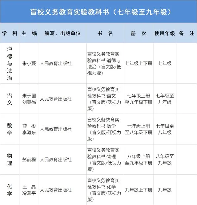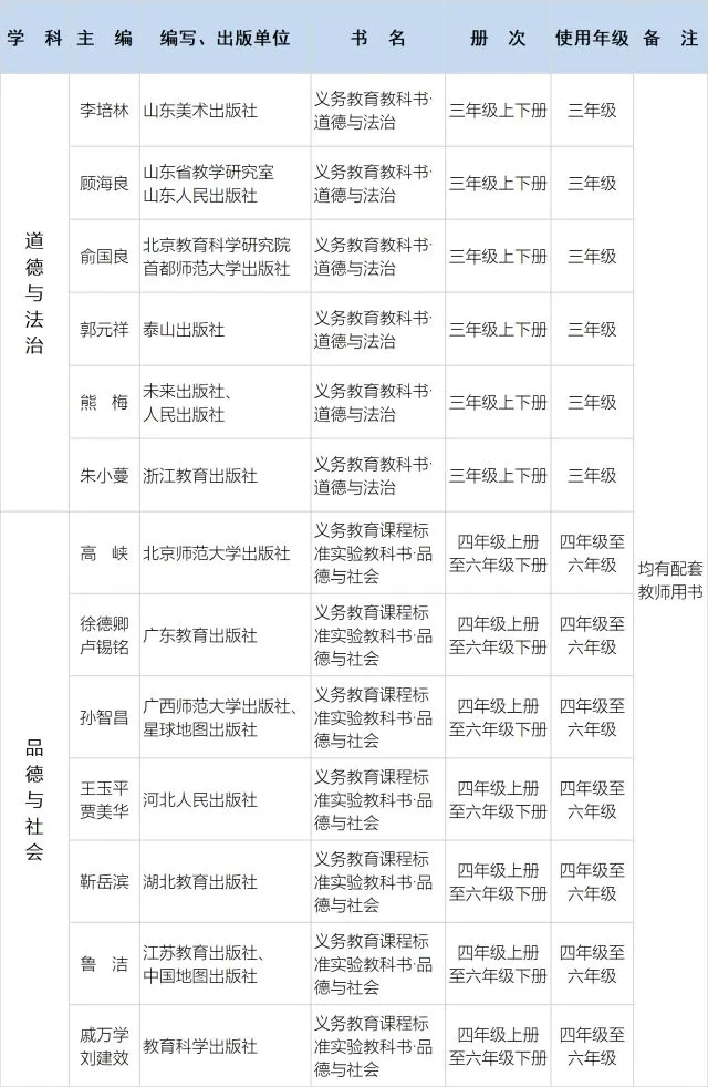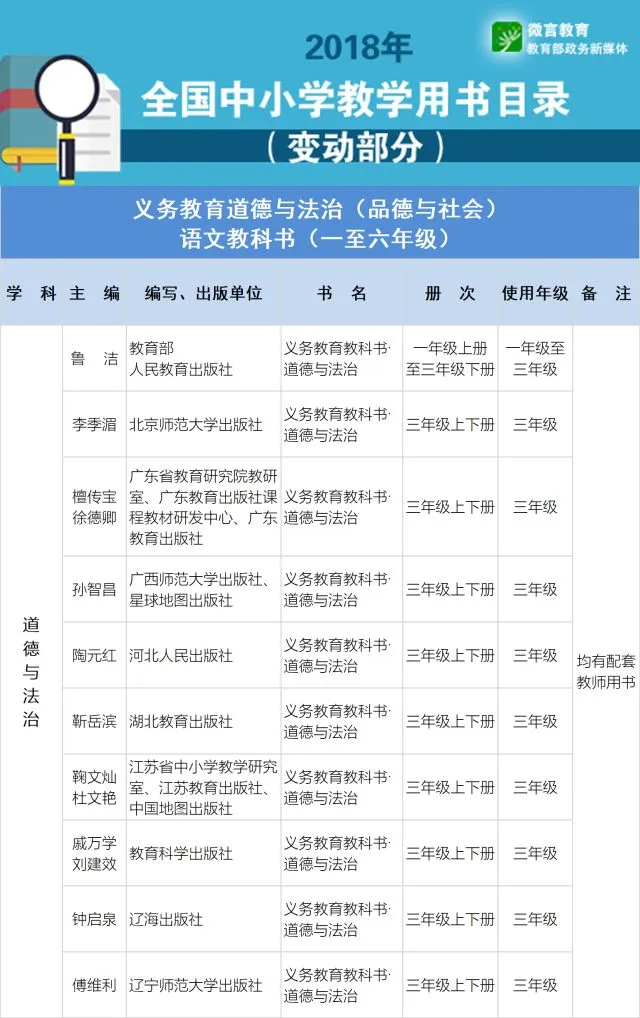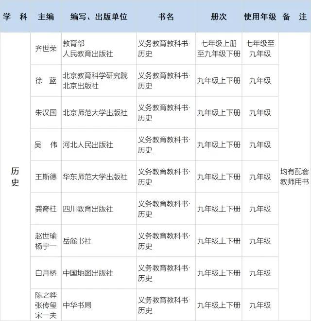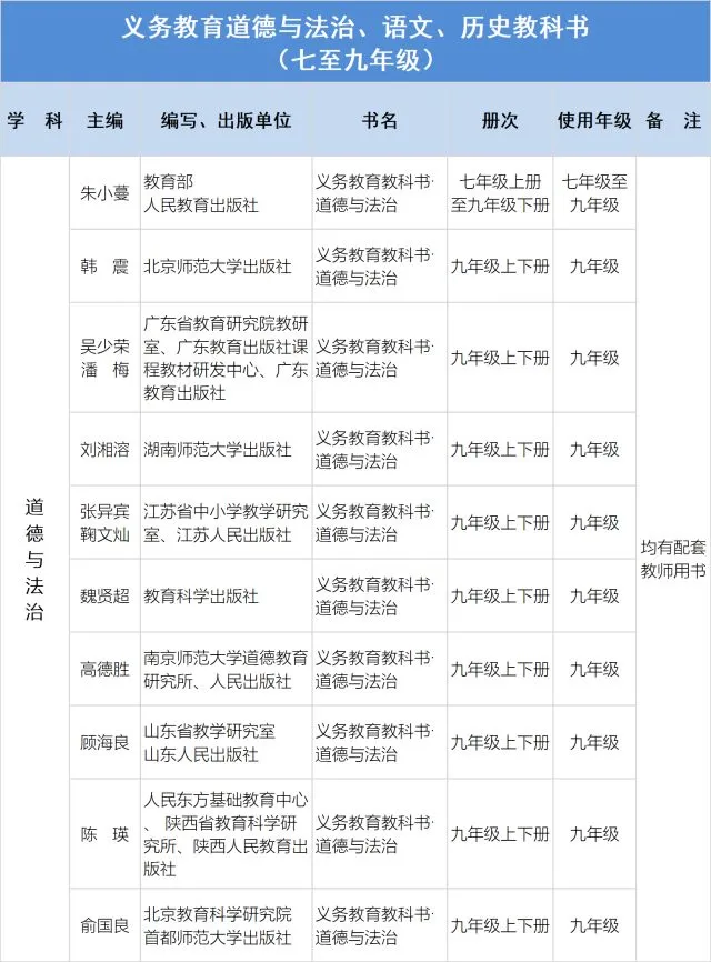 2.实施六·三学制地区,义务教育一、二年级和七、八年级统一使用统编《道德与法治》《语文》教材;七、八年级统一使用统编《历史》教材。原使用人民教育出版社三科教材地区的三年级和九年级使用统编三科教材。