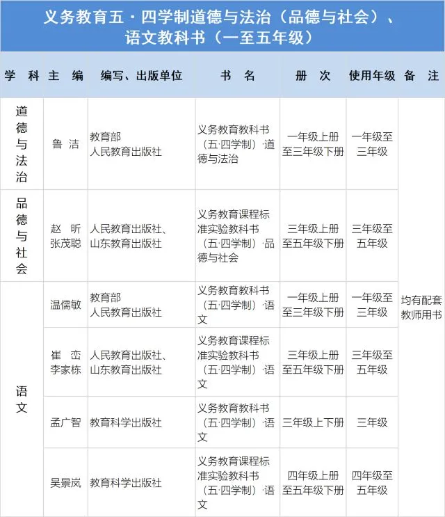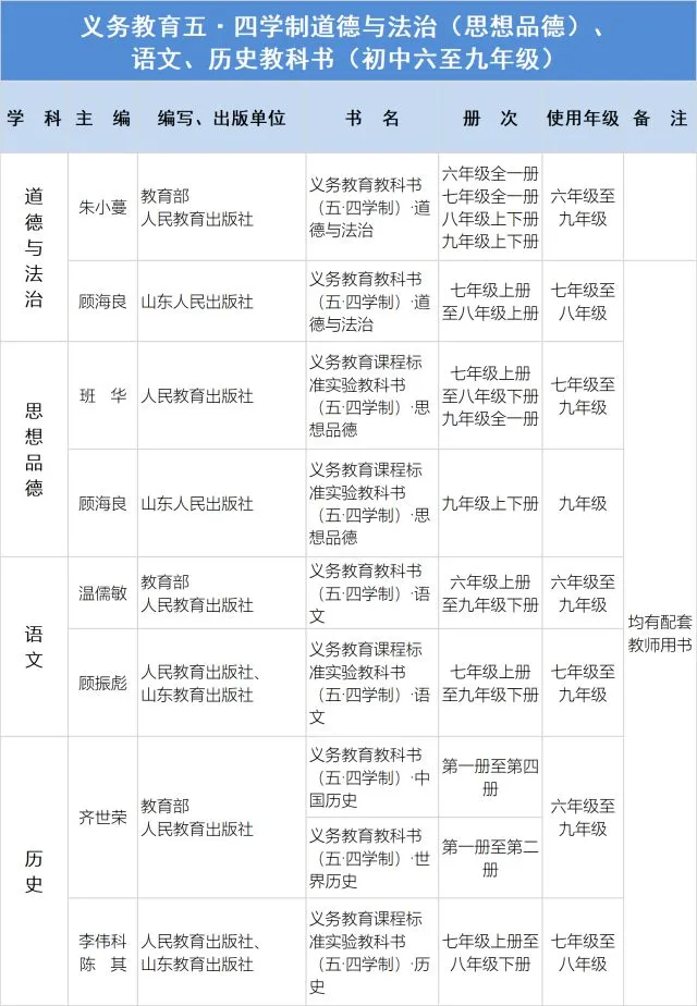 实施五·四学制地区,义务教育一、二年级和六年级统一使用统编《道德与法治》《语文》五·四学制教材,初中历史课程起始年级统一使用统编《历史》五·四学制教材。道德与法治八年级下全部使用统编法治专册教材。其他年级,可根据《2018年全国中小学教学用书目录(变动部分)》(见附件)和本地教学实际,确定使用统编三科教材进度。