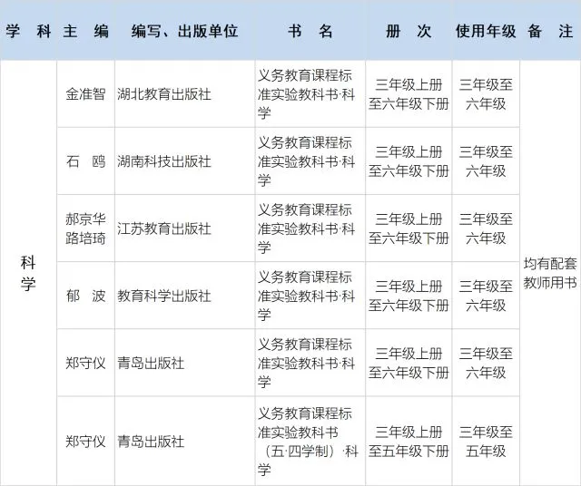3.义务教育一、二年级使用审定通过的增编小学科学教材,三至六年级使用现行教材。因修订审查工作尚未全部结束,仍沿用原选用出版社出版的教材,不得更换其他版本。