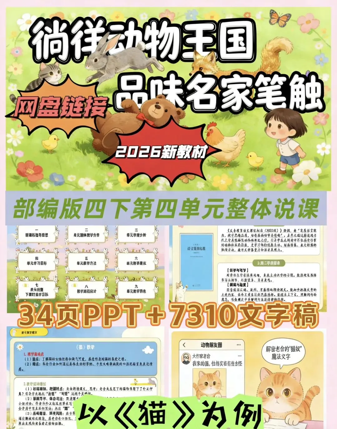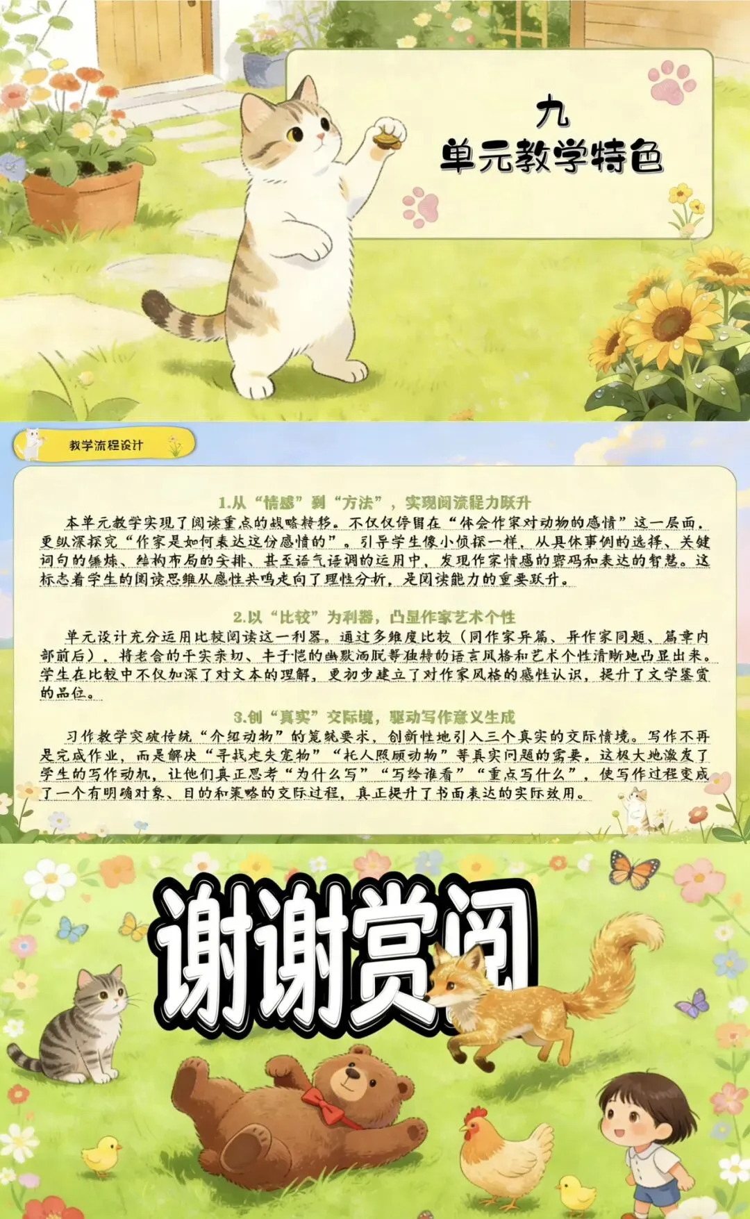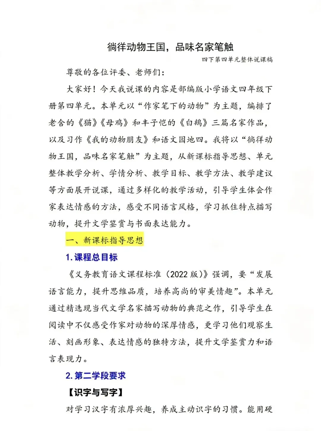 ✨我将以“徜徉动物王国,品味名家笔触”为主题,从新课标指导思想、单元整体教学分析、学情分析、教学目标、教学方法、教学建议等方面展开说课,通过多样化的教学活动,引导学生体会作家表达情感的方法,感受不同语言风格,学习抓住特点描写动物,提升文学鉴赏与书面表达能力。