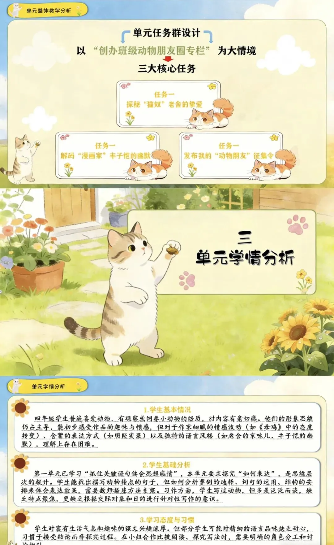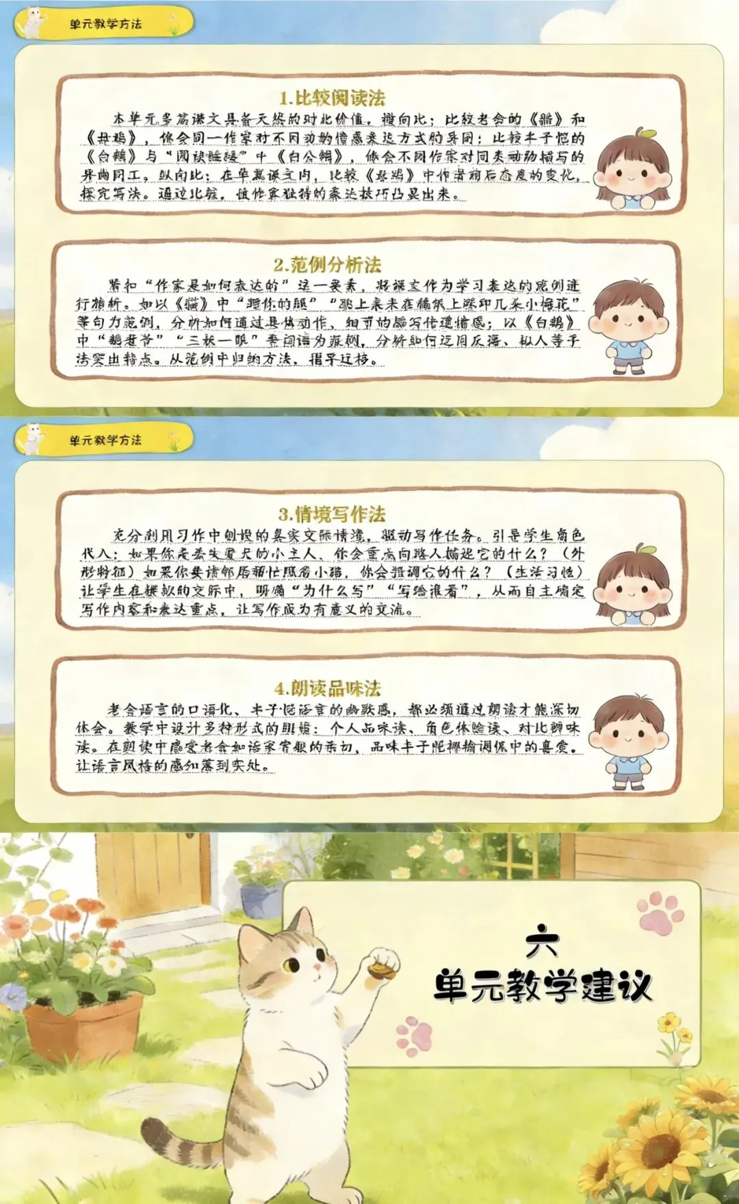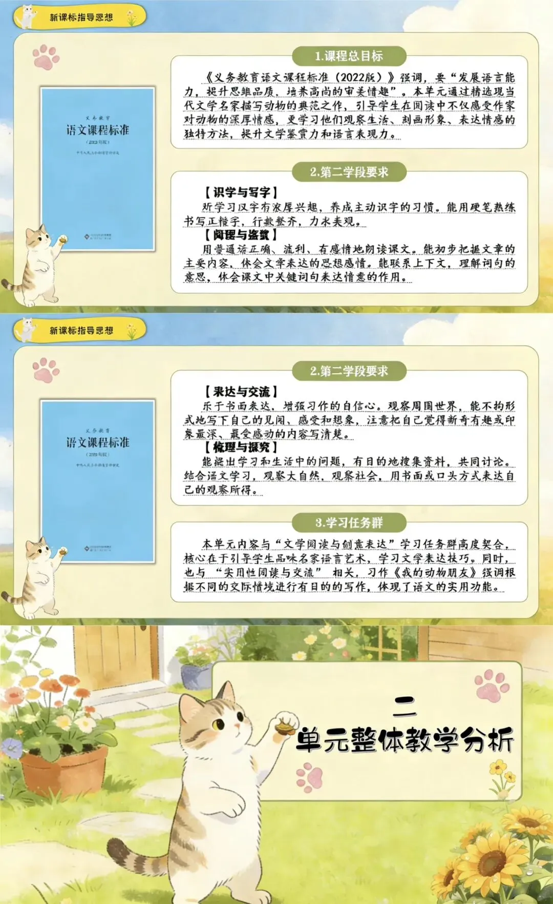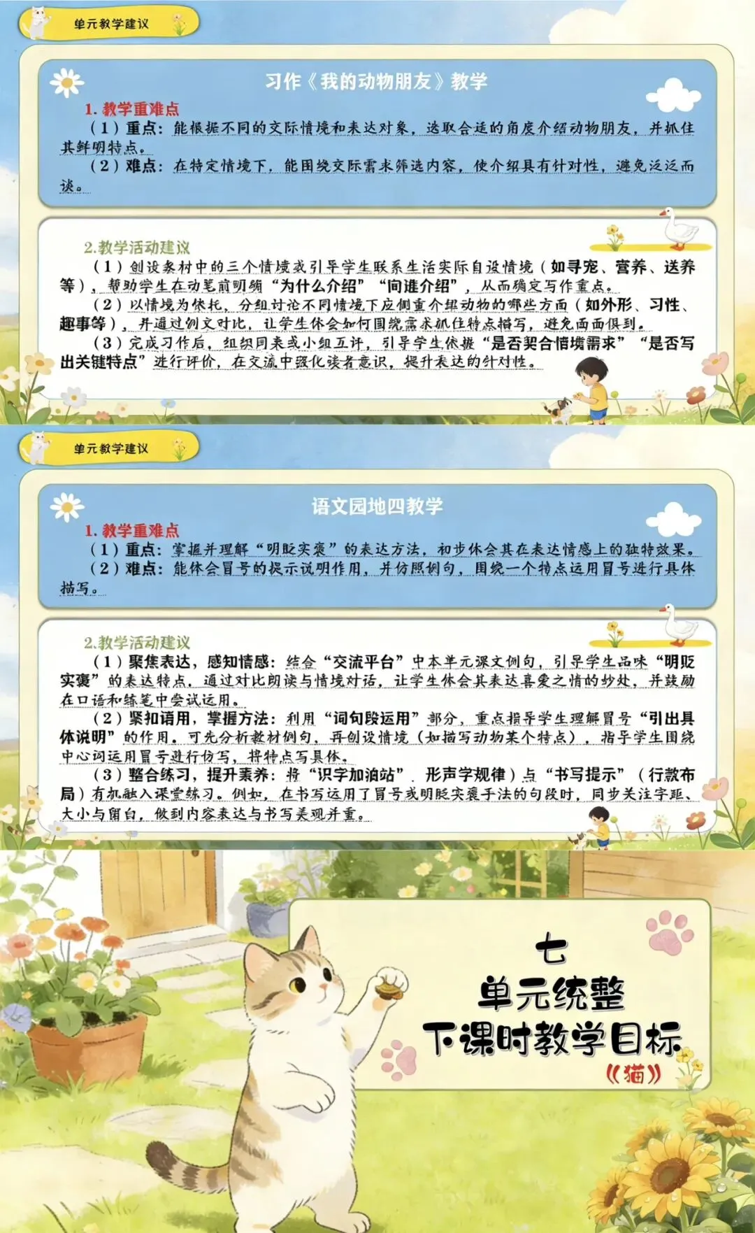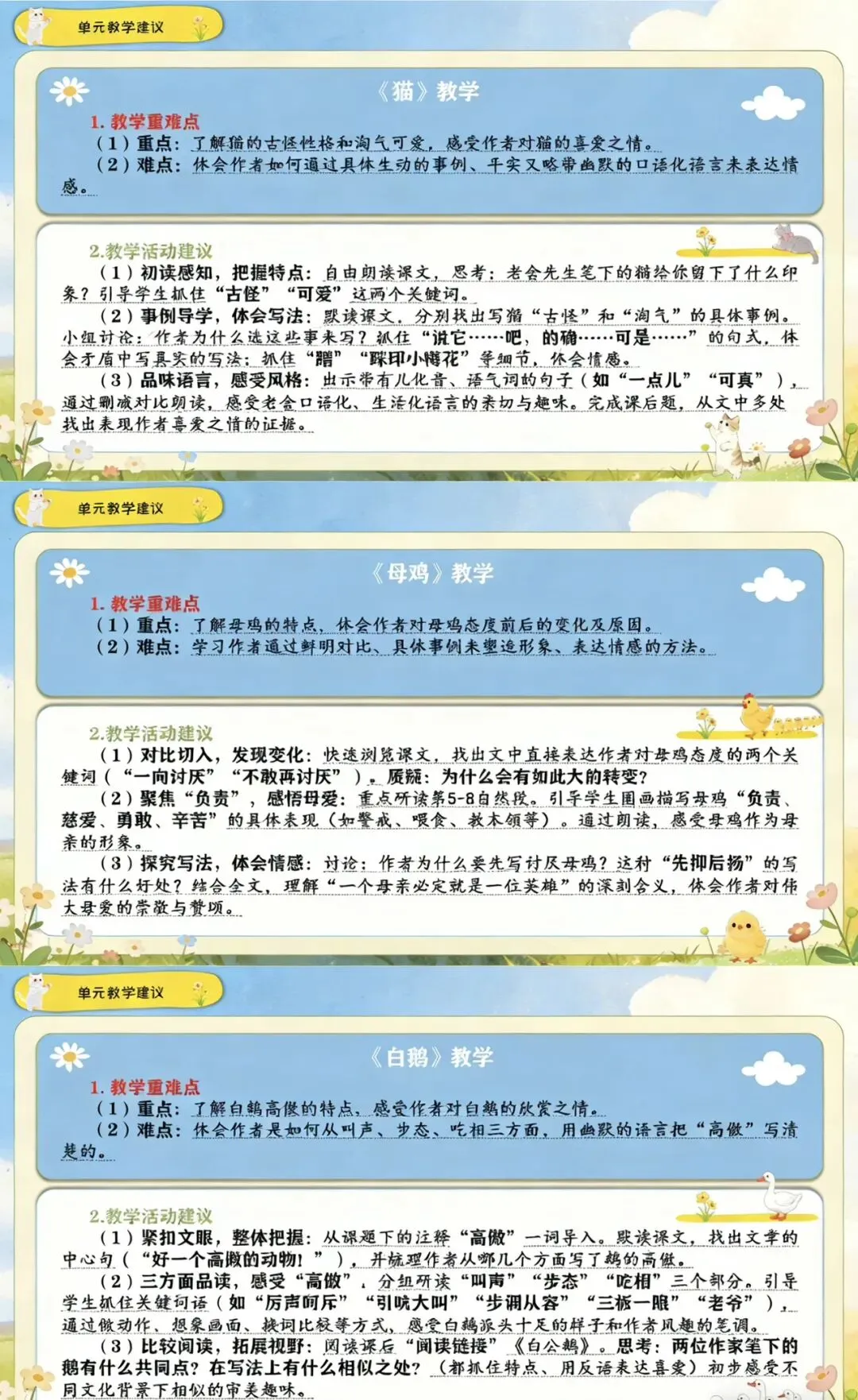本单元以“作家笔下的动物”为主题,编排了老舍的《猫》《母鸡》和丰子恺的《白鹅》三篇名家作品,以及习作《我的动物朋友》和语文园地四。