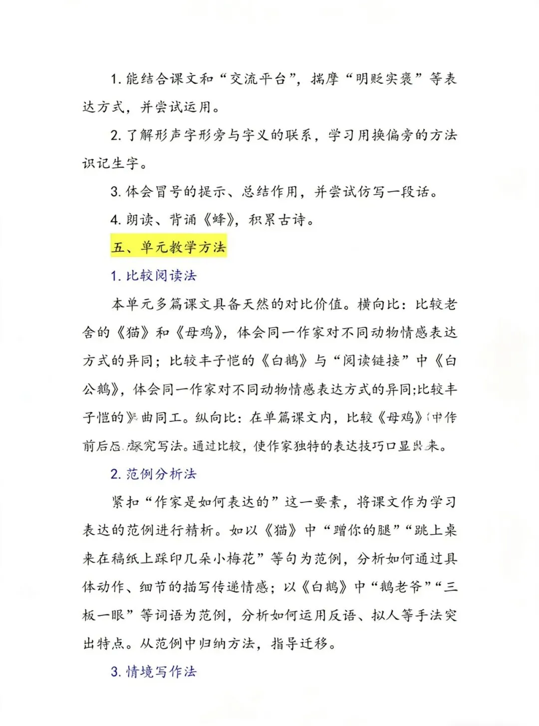 🌟本单元聚焦“作家笔下的动物”,精选了三位文学大师风格各异的作品,为学生提供了高质量的文学阅读范本。老舍先生的《猫》以亲切自然、略带幽默的北京口语,细腻刻画了猫性格的“古怪”与小猫的“淘气”,字里行间洋溢着深切的喜爱;《母鸡》则通过作者对母鸡情感态度的鲜明对比(由“讨厌”到“尊敬”),运用欲扬先抑的手法,塑造了一位“负责、慈爱、勇敢、辛苦”的鸡母亲形象,深情歌颂了母爱的伟大。丰子恺先生的《白鹅》则以风趣幽默、略带调侃的笔调,从叫声、步态、吃相三方面,活灵活现地勾画出一只“高傲”十足的白鹅,表现了作者欣赏、玩味的雅趣。三篇作品,情感真挚,特点鲜明,语言各具神采。此外,习作《我的动物朋友》创设了“寻找走失小狗”“请邻居照看小猫”“请同学收养小兔”三种真实交际情境,引导学生为不同的目的、向不同的对象介绍动物,使写作具有明确的交际功能。语文园地四则通过“交流平台”等板块,系统梳理“明贬实褒”等表达方法,并进行迁移运用。
