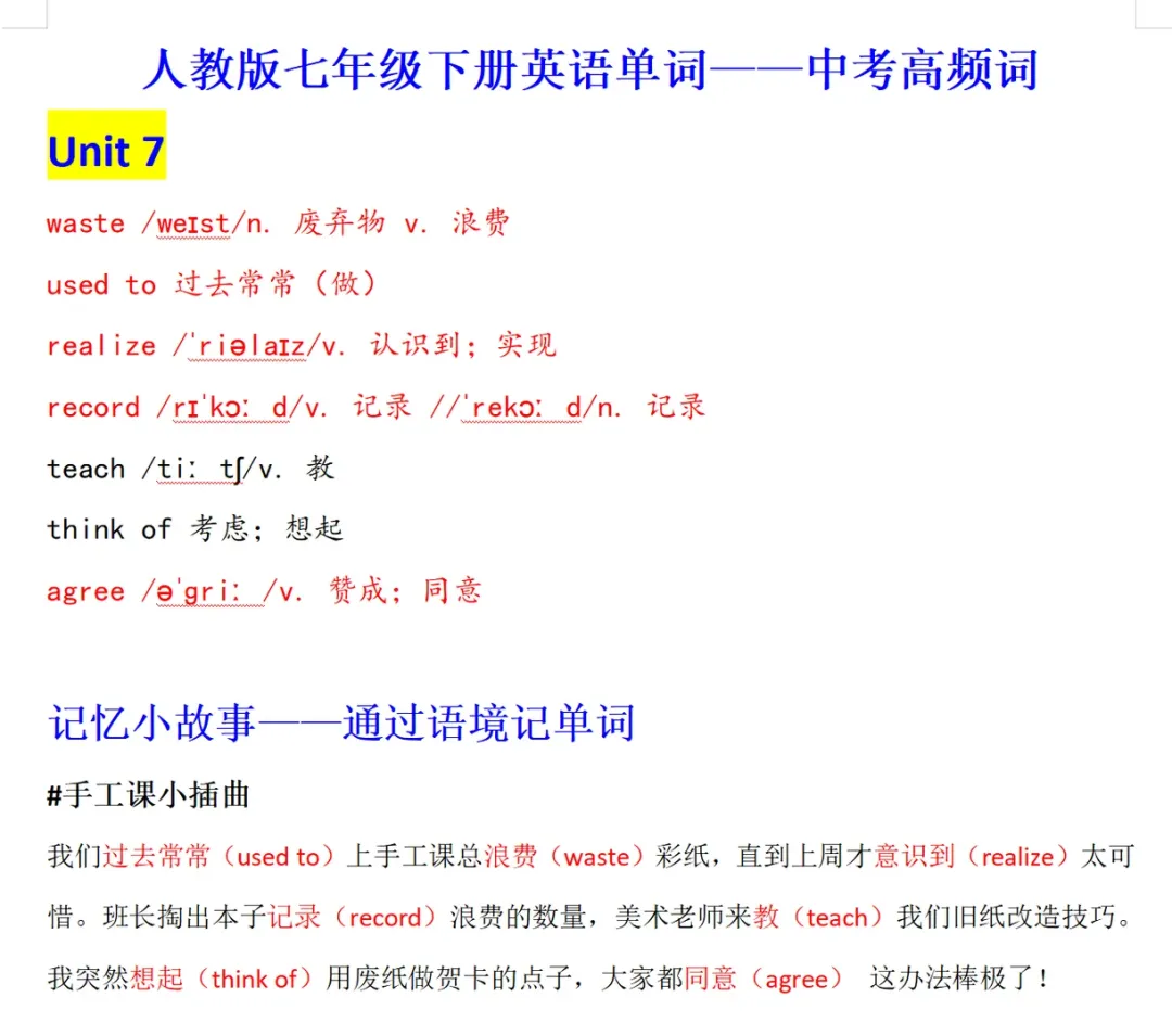 >(2026年新教材)人教版初中七年级下册英语同步教材单词表知识汇总+中英语互译默写表