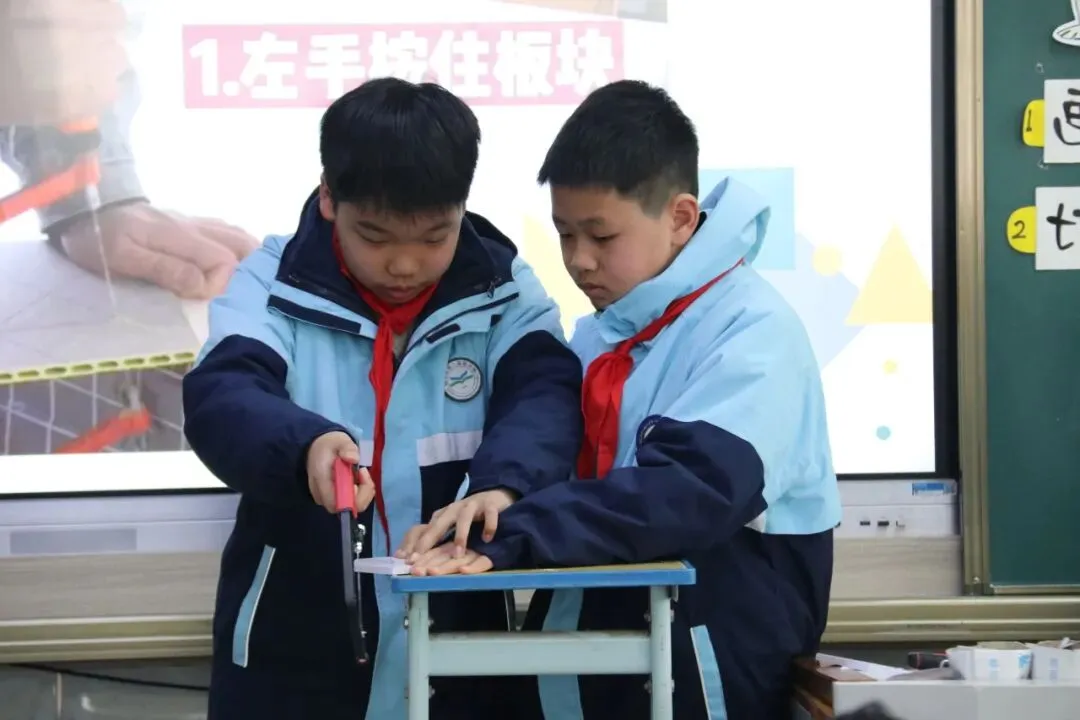 课堂上,张老师先引导学生认识制作工具,掌握七巧板模板的绘制方法,随后组织学生以小组为单位,分工协作,用锯子细心切割、打磨,完成七张板块的制作。在此基础上,教师鼓励学生结合冬奥会运动项目,对七巧板进行创意拼接与迭代美化,让传统七巧板焕发新活力,学生在协作与创新中,动手能力与思维能力得到双重提升。