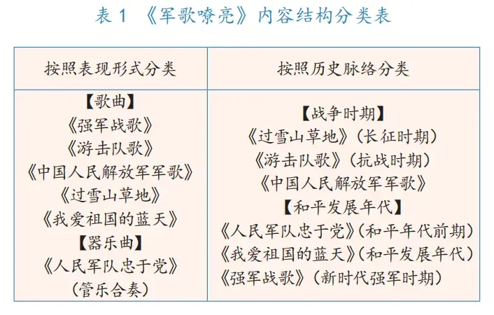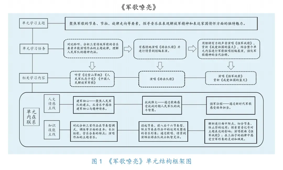 聆听《强军战歌》,剖析进行曲风格的附点与切分节奏,于高亢旋律中感受军队昂扬向上的斗志;对比《人民军队忠于党》的声乐版与管乐合奏版,从音色、织体、力度等方面辨识不同版本对主题的诠释差异;赏析《游击队歌》,结合1937年创作背景,借前八后十六的节奏特点,品游击队员灵活机智的作战风采;解读《过雪山草地》,透过藏族音乐元素,在刚柔并济的旋律里,体会雪域高原的苍凉,更感受红军坚韧顽强的斗志;追溯《中国人民解放军军歌》创作历史与发展脉络,从附点节奏及连续上行旋律,理解军队一往无前的气魄;解析《我爱祖国的蓝天》,歌曲突破传统军歌风格,以圆舞曲三拍子增添灵动韵律,借大小调交替既抒发对祖国的眷恋又展现军人豪情,勾勒出空军风貌,升华了爱国情怀。