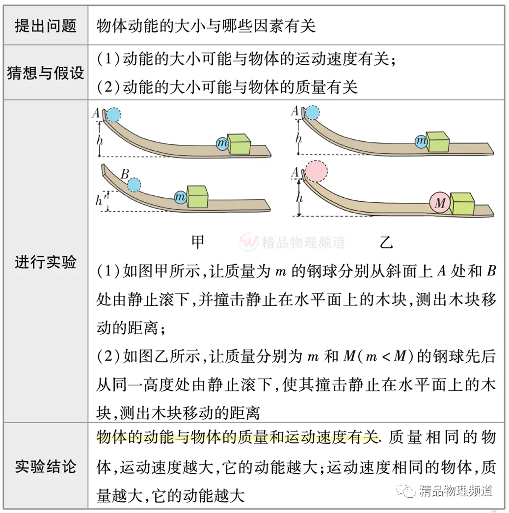 (3)若木块与水平面没有摩擦,不能够得出结论,因为若水平面光滑,根据牛顿第一定律,钢球和木块将一直运动下去,没有运动距离的远近之分,就不能达到通过比较距离来比较动能大小的目的。