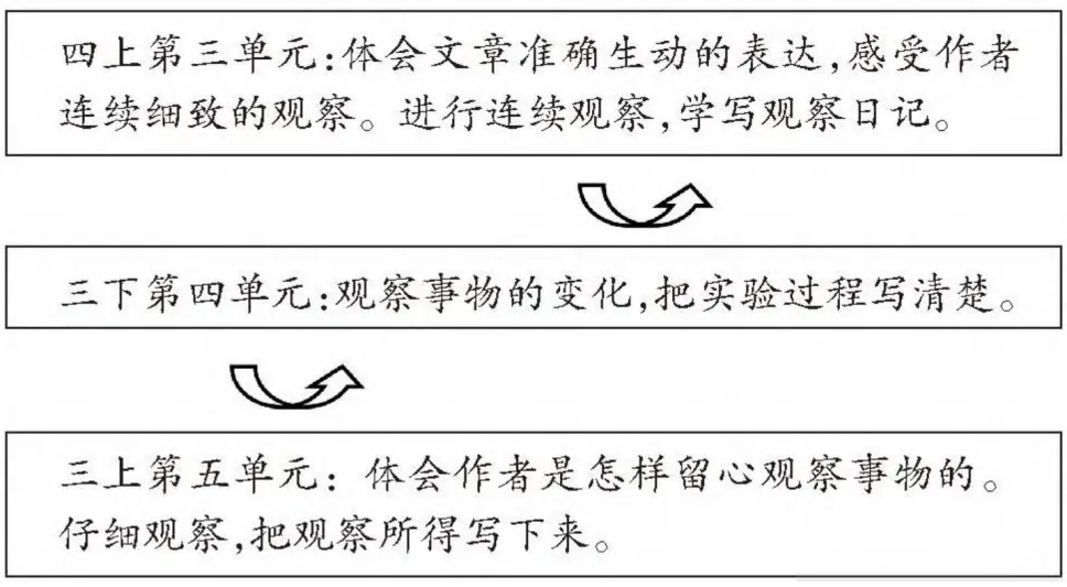 首先,纵向梳理。《义务教育语文课程标准(2022年版)》在第二学段(3-4年级)“表达与交流”部分提出“观察周围世界,能不拘形式地写下自己的见闻、感受,注意把自己觉得新奇有趣印象最深的内容写清楚”[3],这是语文要素的上位概念,统编教材围绕这个上位概念编排了三个单元,形成观察能力序列(见图1)。