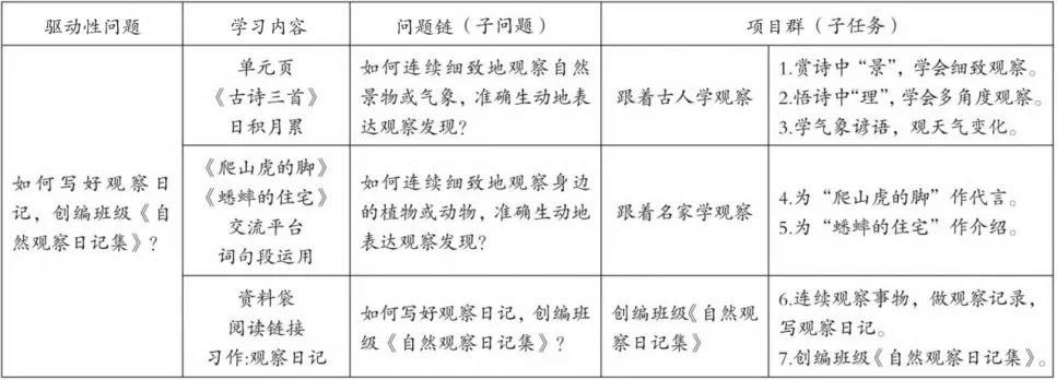 分解驱动性问题应依据学生学习需求,对教材内容进行微调、重组,使教材内容结构化,保证驱动性问题分解的逻辑性。笔者将语文园地中的“日积月累”与《古诗三首》整合,形成“古人观自然”主题,把“交流平台”和“词句段运用”渗透到精读课文学习中,将“资料袋”“阅读链接”作为习作指导资源。针对三个板块的学习内容,将驱动性问题分解为三个子问题,设计七个子任务,形成驱动性问题统摄下的问题链和项目群(见表1)。