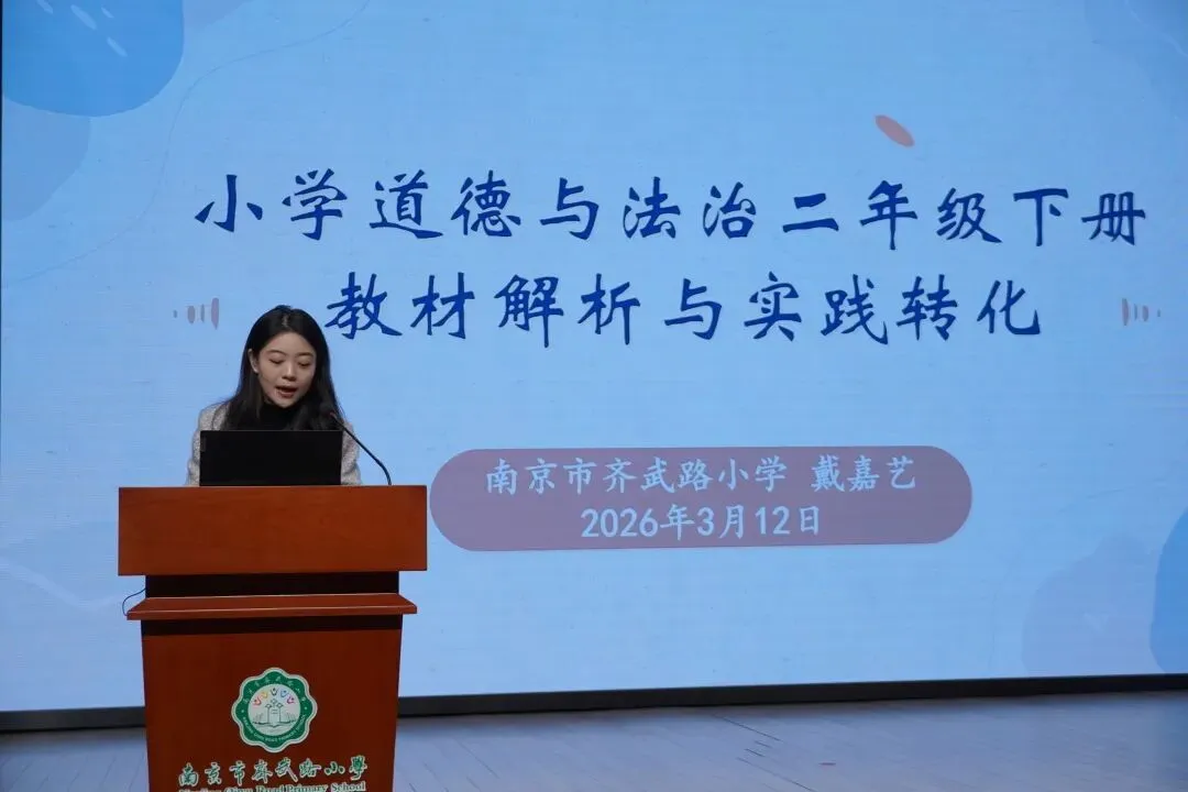 在专题讲座环节,两位教师围绕新教材的理念与实践展开深度解析。南京市齐武路小学戴嘉艺老师作了题为《小学道德与法治二年级下册教材解析与实践转化》的分享,结合具体教学案例,系统梳理教材编排逻辑,提炼出切实可行的教学策略,助力教师在日常教学中有效落地。