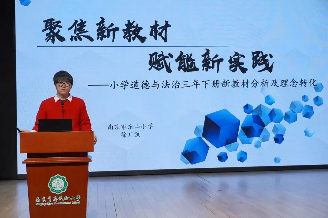 南京市东山小学徐广凯老师以《小学道德与法治三年级下册教材理念转化与教学设计》为题,聚焦新教材的理念升级与教学导向,既呈现典型课例,又进行理论剖析,为与会教师提供了可借鉴、可操作的教学设计思路。