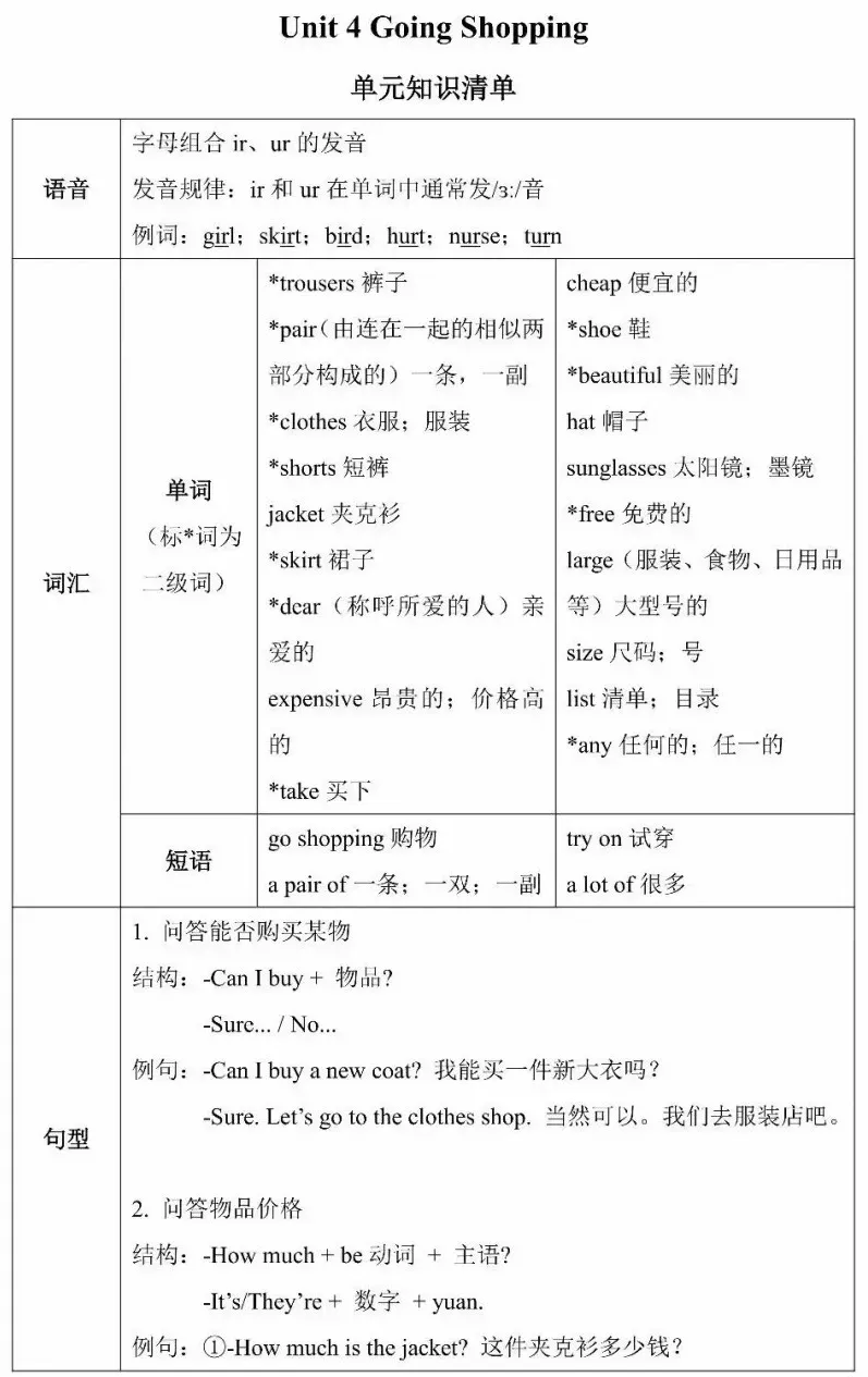 问答能否购买某物结构:-Can I buy + 物品?-Sure... / No...例句:-Can I buy a new coat? 我能买一件新大衣吗?-Sure. Let’s go to the clothes shop. 当然可以。我们去服装店吧。