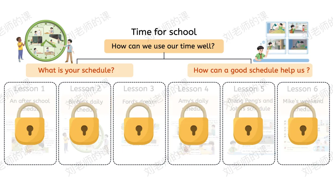 【概括与梳理】根据语篇,梳理如何谈论日程安排,引导学生从时间+事件两方面进行描述。