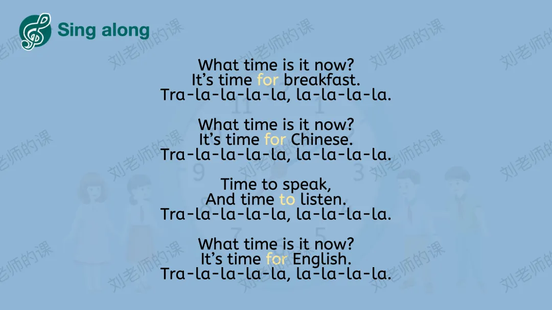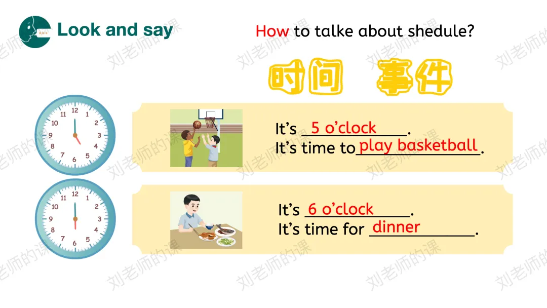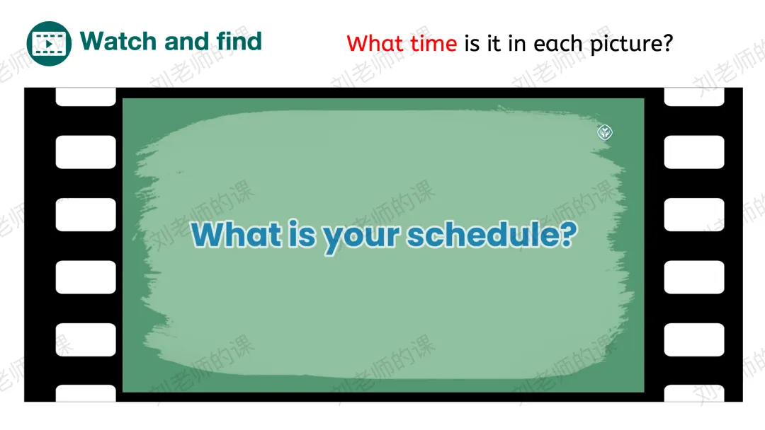 【感知与注意】观看开篇页主题歌曲视频,之后呈现歌曲画面的时间和活动,给出语言框架,引导学生说出内容并尝试跟唱。