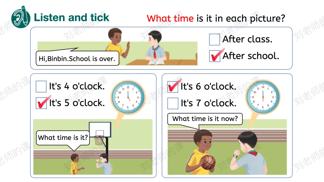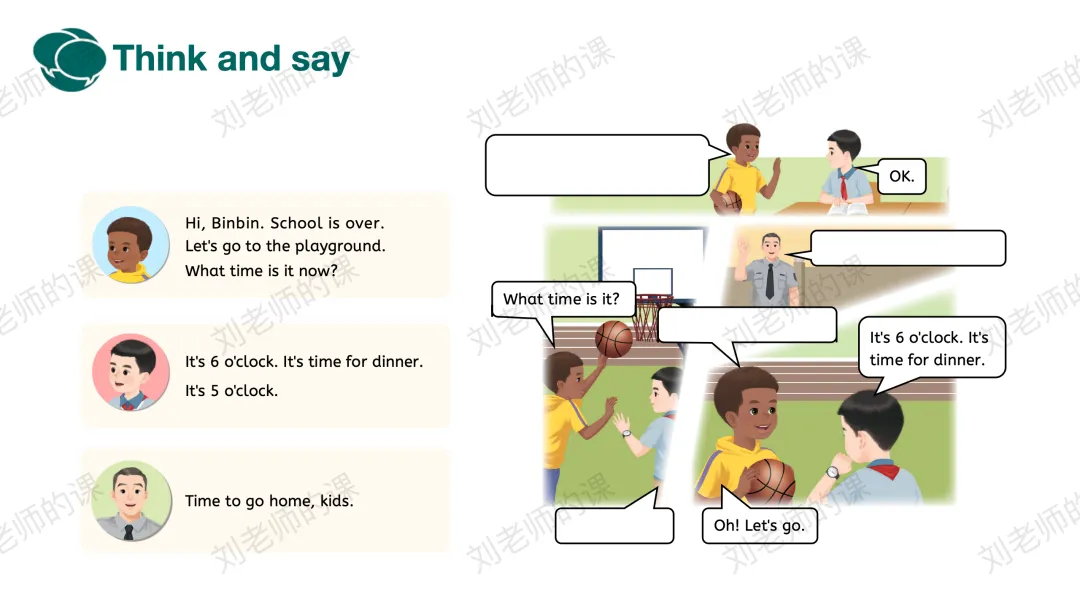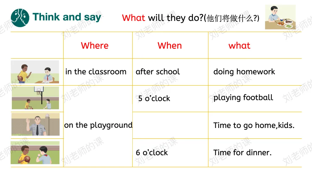 【想象与创造】通过看图片编对话,分享自己的放学后的安排进行目标语言的运用,深化语言运用能力。