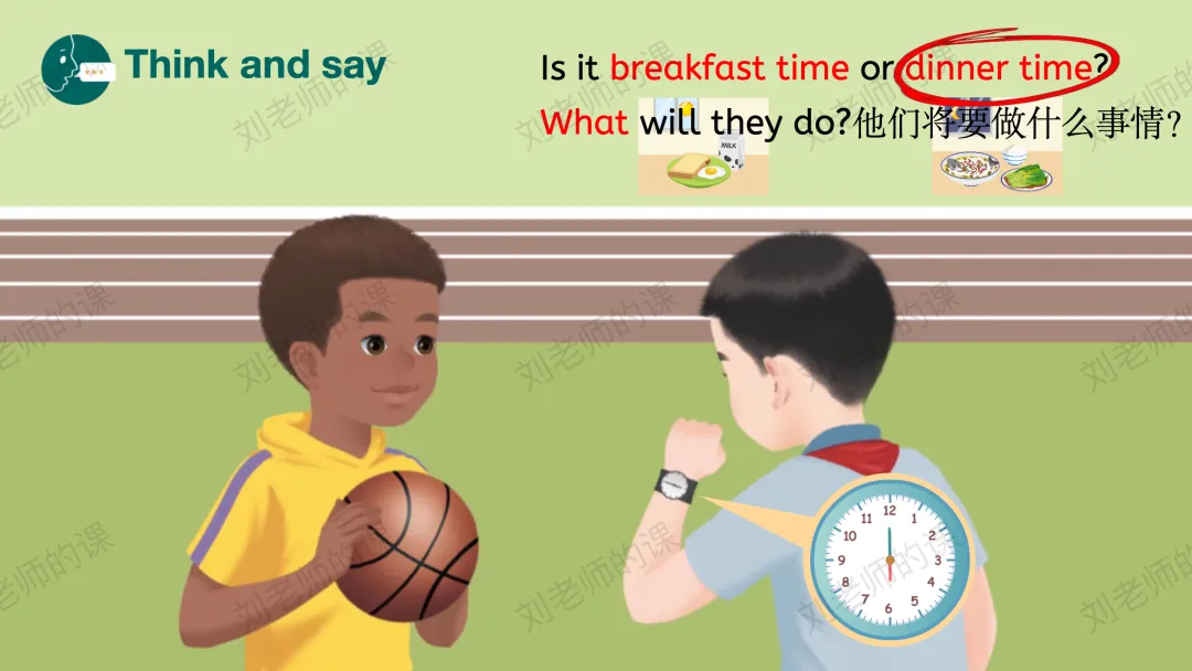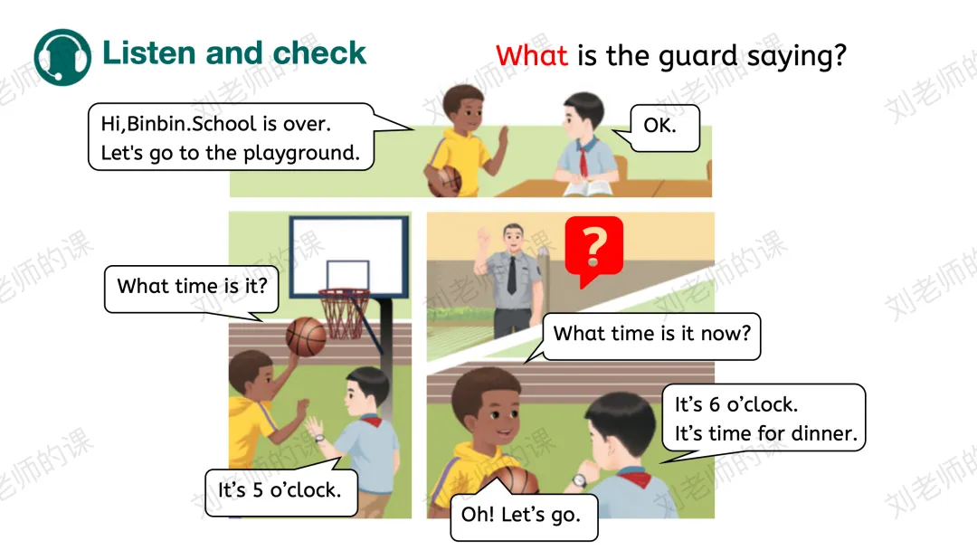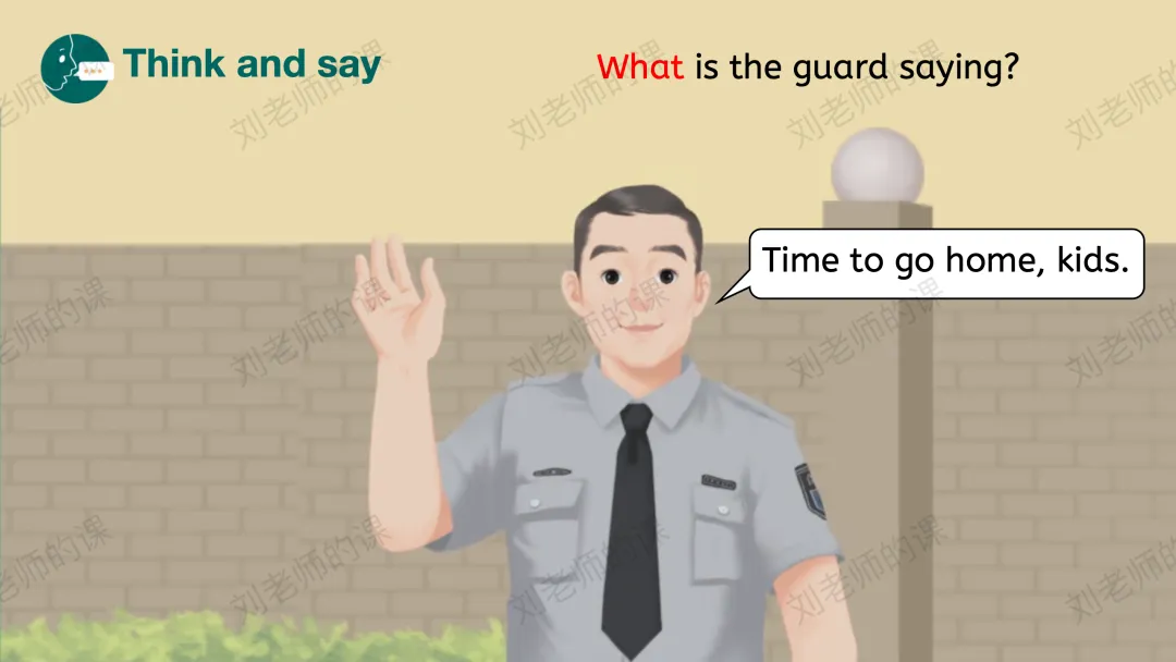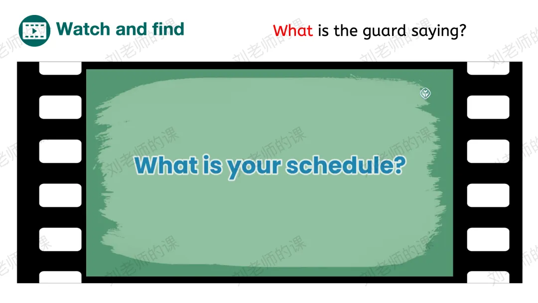 【获取与梳理】基于时间的话题,引导学生看图,初步了解Who?Where?What?之后通过看视频,听音选择确定每张图的时间,猜测他们将会做的事情。以听音核对的方式将语言整合,并抛出问题:What is the guard saying?带着问题再次观看视频,了解整体内容。