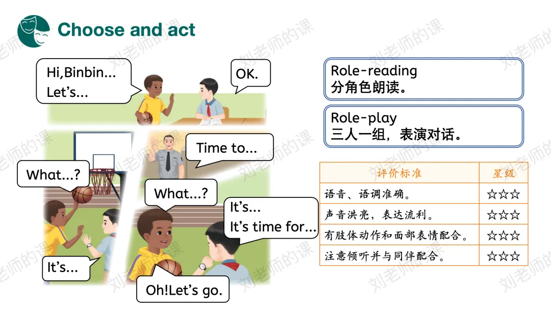 【内化与应用】通过扣空、听音模仿、配音、角色扮演等活动内化语言。