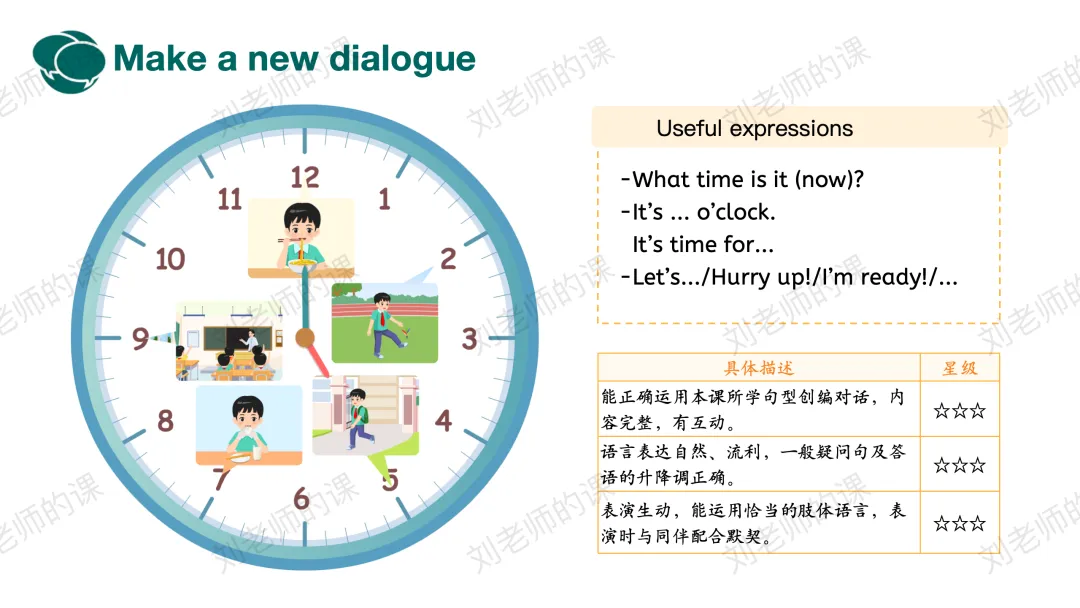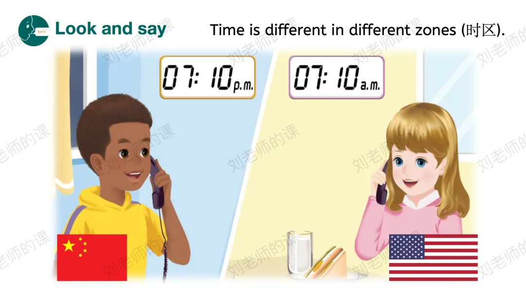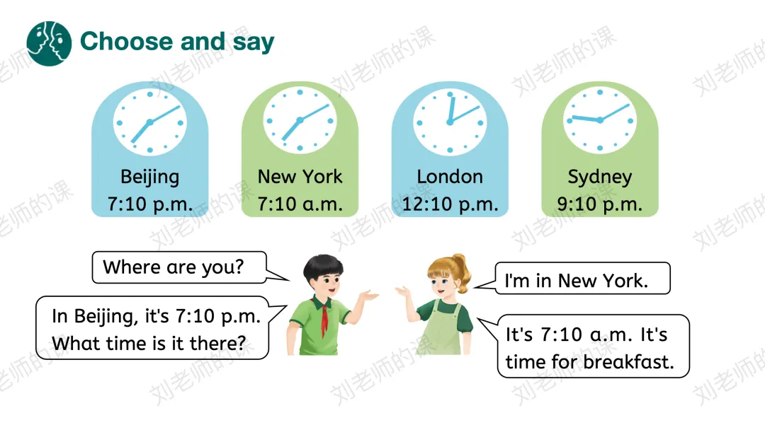 【描述与阐释】看图,从Who?What?What time?等方面对图片进行描述,梳理出不同时区时间不同的结论。之后呈现不同城市的时间,引导学生使用目标语言进行会话。
