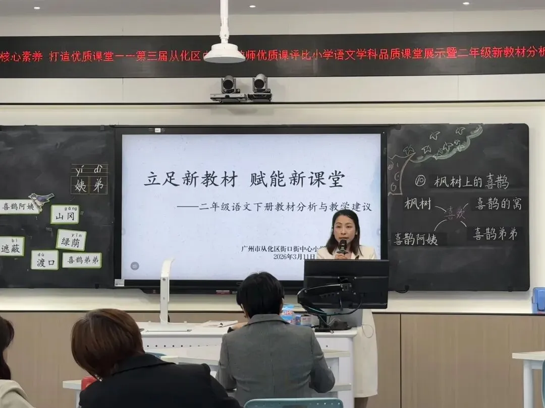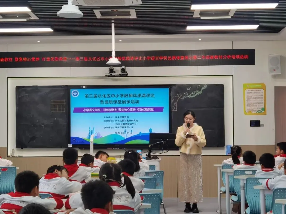 春启新程,研思致远;语文同行,薪火相传。为落实义务教育优质均衡区创建目标,确保人教版小学语文新教材顺利实施,帮助教师精准把握新教材编写理念与教学重点,提升课堂教学质量和学生核心素养培养能力,2026年3月11日上午,从化区2025学年第二学期小学语文优质课展示暨二年级新教材分析培训活动在雅居乐小学雅正楼四楼智慧课室顺利开展。全区一、二年级语文教师齐聚一堂,共赴这场深耕语文教学的教研之约。