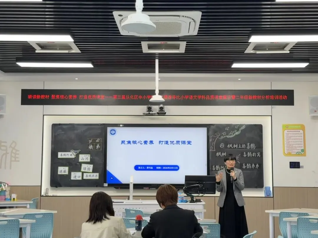 本次活动以“研读新教材 聚焦核心素养 打造优质课堂”为主题,由广东外语外贸大学从化实验小学的李婷沁老师主持,活动设置优质课例展示、新教材专题培训、活动总结点评三大环节,层层递进、干货满满,为一线语文教师搭建了学习交流、思维碰撞的优质平台。