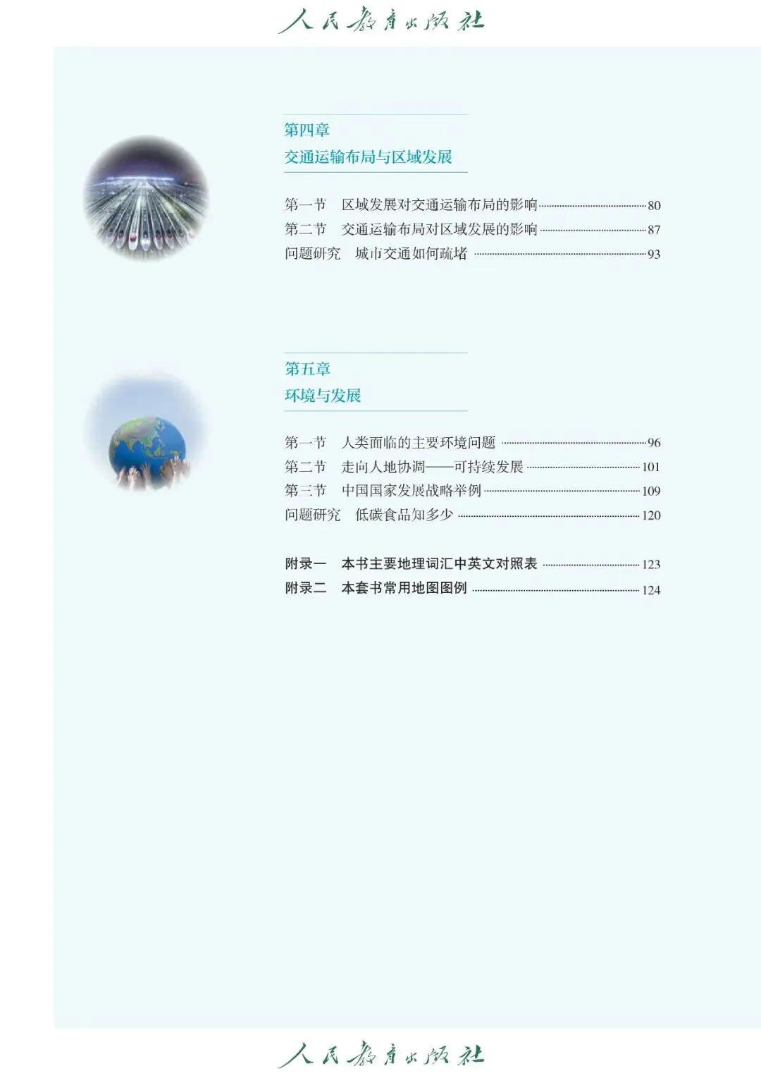 【5】第五章 环境与发展:主要内容包含课文《人类面临的主要环境问题》《走向人地协调——可持续发展》《中国国家发展战略举例》,核心内容有主要环境问题表现及成因、可持续发展内涵与原则、主体功能区、长江经济带等国家发展战略