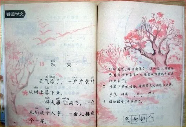 翻到秋天这一课,眼泪真的忍不住了,那句天气凉了,一片片黄叶从树上落下来读起来.还是.那么熟.悉。一群大雁排成人字飞向南.方,老师让我们观.察窗外.的梧桐树,那个秋天的.午后.阳光,仿佛还.洒在课桌上。