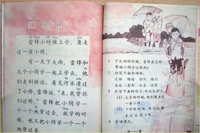 过桥这一课.印.象.太深了,雷锋叔叔背着小.同.学过桥的故事,那时候的我们听了都.想学雷锋做好事。现在想.想.,.那个年代的课本,教给.我们的不只是.知识,更多.的是做人的道理。