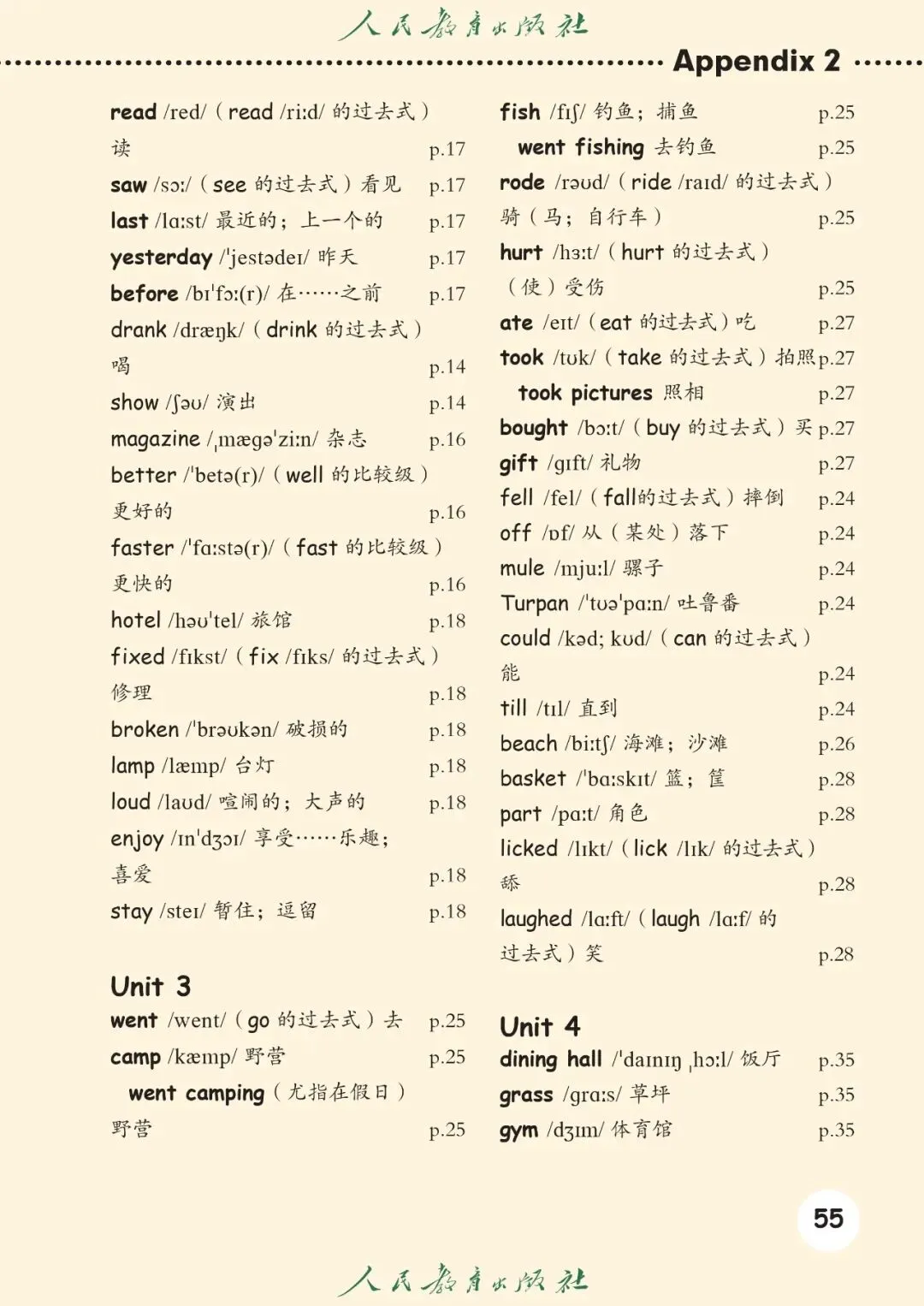 13、went /went/ v. 去(过去式)14、saw /sɔː/ v. 看见(过去式)15、took /tʊk/ v. 带走(过去式)16、ate /et/ v. 吃(过去式)17、bought /bɔːt/ v. 买(过去式)