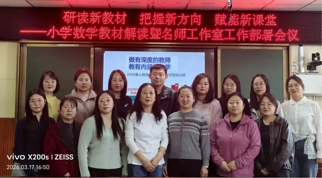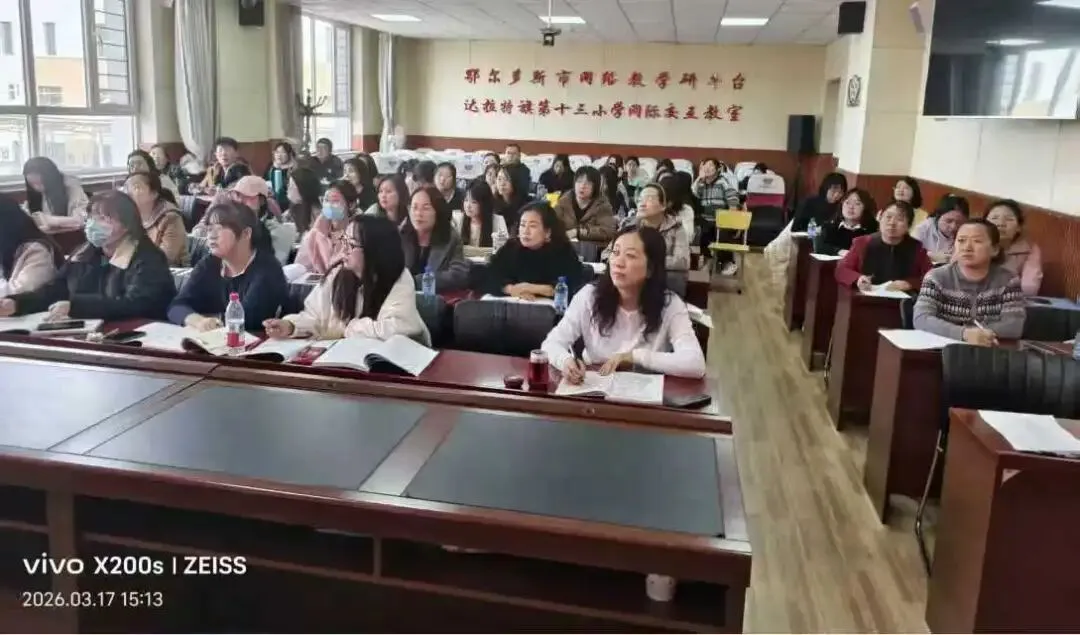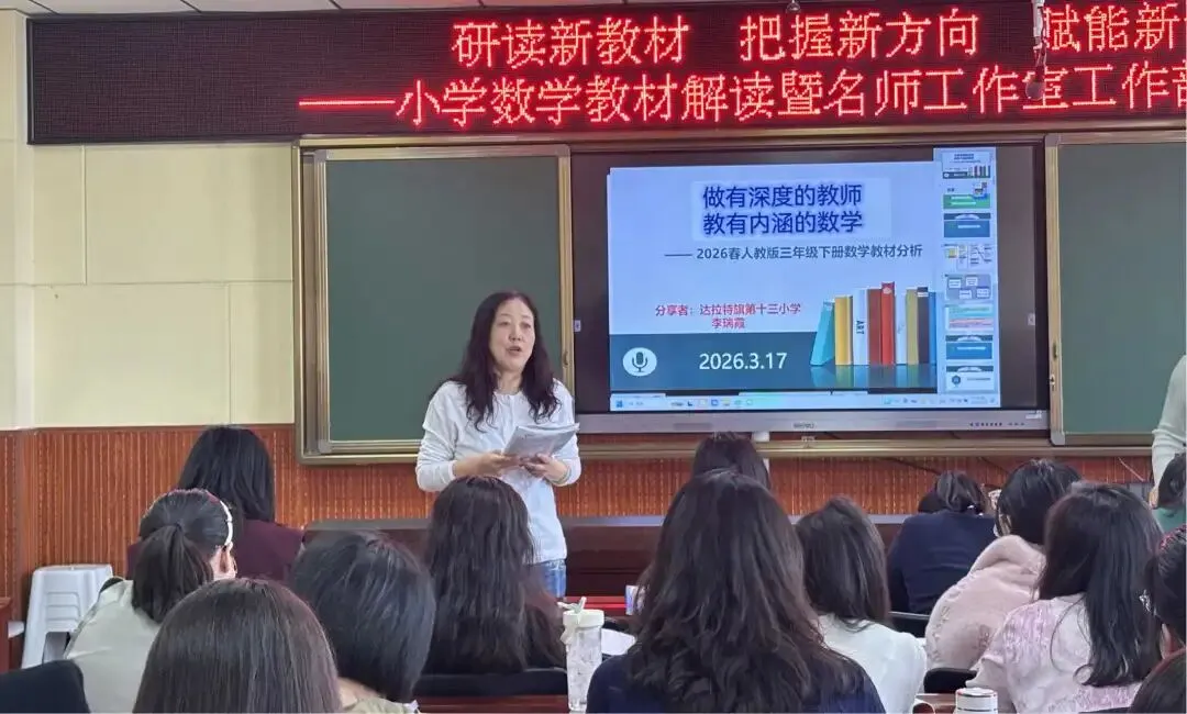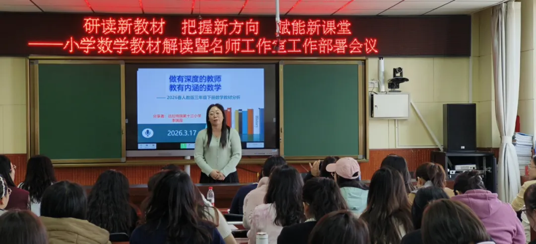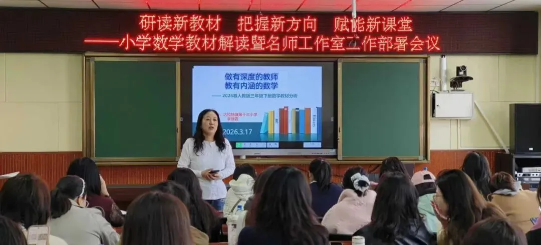 春风送暖,研思致远。为精准落实义务教育数学课程标准要求,扎实推进新教材教学落地,2026年3月17日下午,小学数学三年级下册教材解读暨韩丽名师工作室(第25期)学期工作部署会议在第十三小学二楼会议室隆重召开。全旗三年级数学教师及韩丽名师工作室全体成员齐聚一堂,共赴这场聚焦核心素养的教研之约。