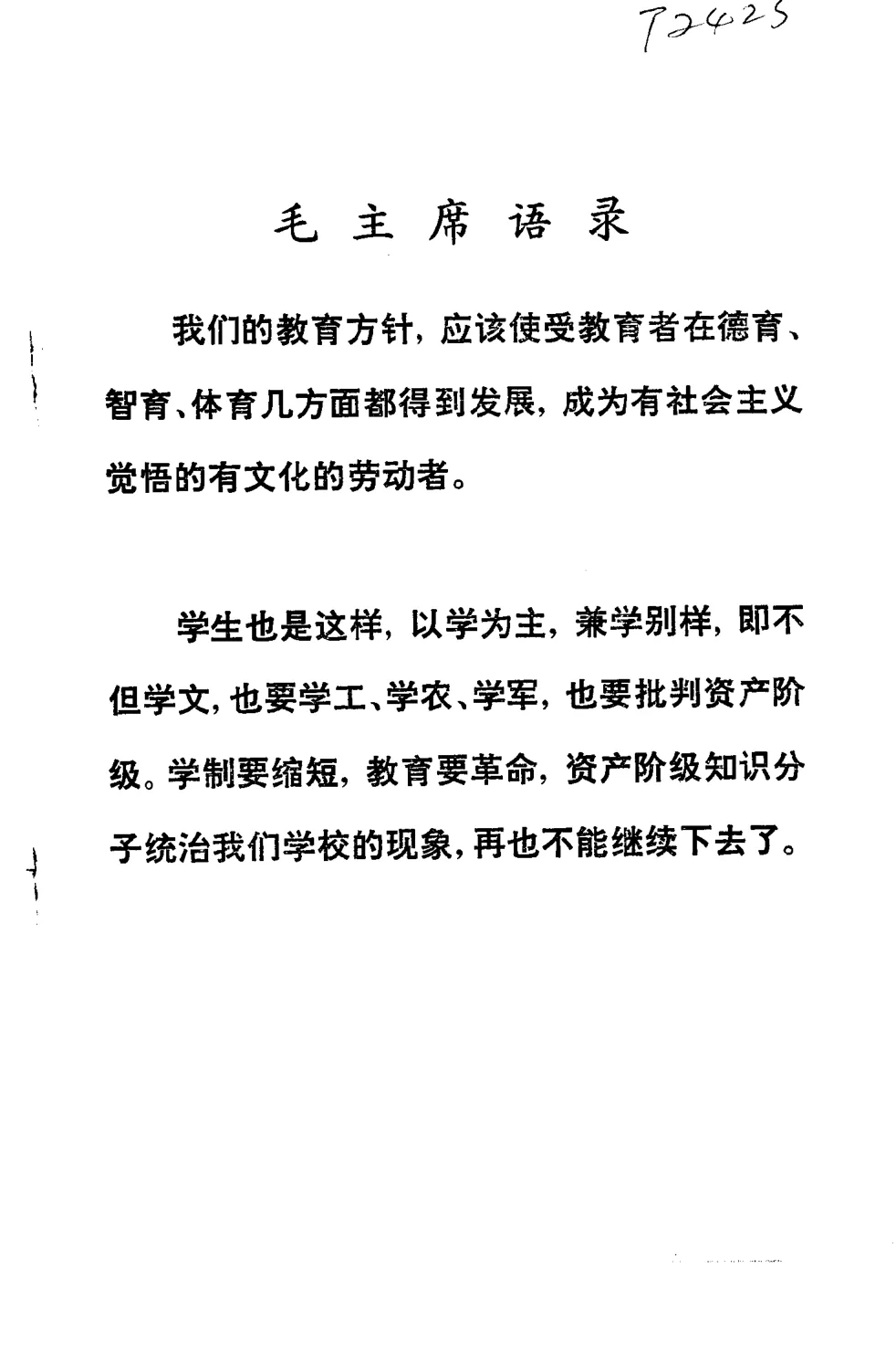 毛主席语录 "我们的教育方针,应该使受教育者在德育、智育、体育几方面都得到发展,成为有社会主义觉悟的有文化的劳动者。"