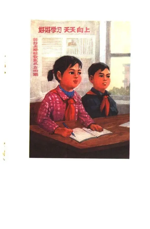 紧接着是一幅彩色插画:两个戴红领巾的少年坐在课桌前,背后墙上贴着"好好学习 天天向上"。这幅画的画风,今天看来竟然有种莫名的「苏联社会主义写实」美感。