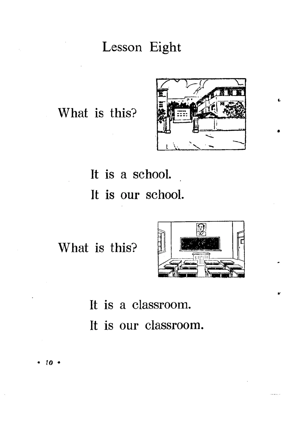 到第八课,教的是学校场景:It is a school. It is our school. It is a classroom. It is our classroom. 配图里的教室墙上,挂着一幅画像,课桌整整齐齐地排列着。