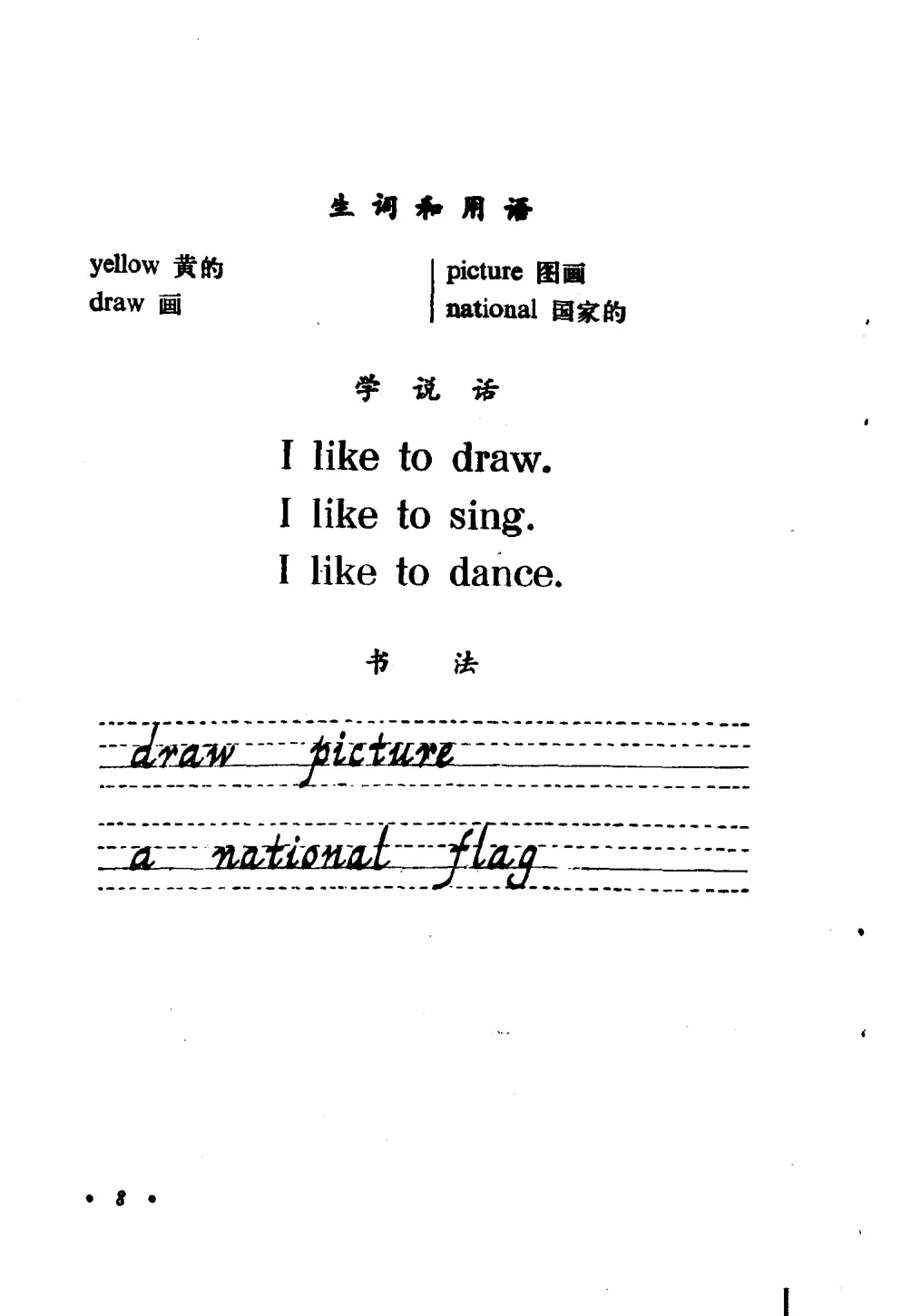 第四课更有意思,教画画:"Let's draw a picture. Let's draw a national flag."——来,我们画一幅画吧!画什么?画国旗。