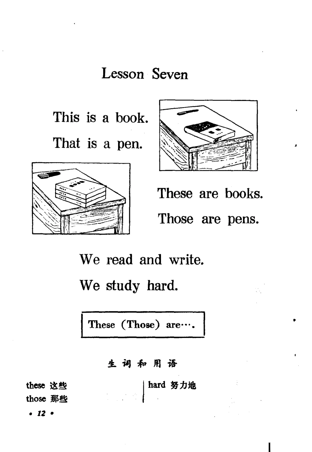 还有第一册第十二课,教的是人物身份:I am a pupil. You are a teacher. I am a boy. You are a girl. 配图里一个扎辫子的女孩在打乒乓球,一个男孩在吹气球——这大概是整本课本里最有童趣的一页了。