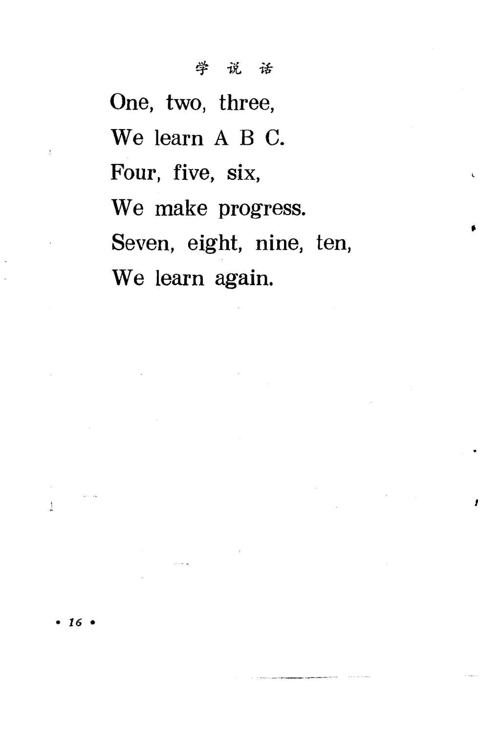 One, two, three, we learn A B C. Four, five, six, we make progress. Seven, eight, nine, ten, we learn again.