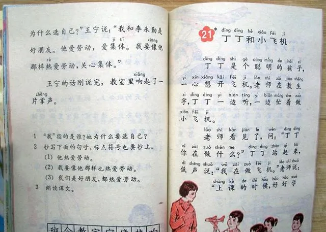 再往后,《谜语》《这个办法真好》《送雨衣》《她是谁》《我选我》《丁丁和小飞机》,这些题目一摆出来,很多80后、70后估计已经开始默念了。以前总觉得课文就是拿来背的,现在再看才发现,它们写的其实都是很具体的小生活:下雨了,有人送衣;班里选干部,有人鼓起勇气;上课分神了,偷偷折个小飞机。不是多大的事,可孩子的世界,本来就是由这些小事组成的。