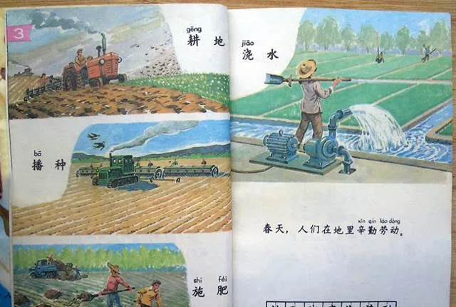 那时候的课本还有个好处,就是风景真像风景,人物真像人物。不会故意弄得太夸张,也不怕留白。孩子一边认字,一边就把季节、田野、村庄、劳动这些东西悄悄记进脑子里了。