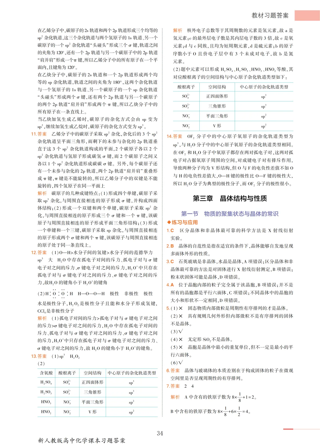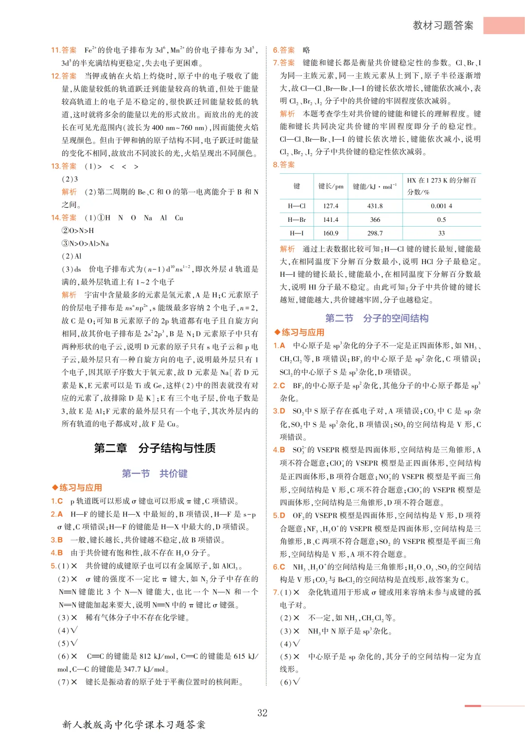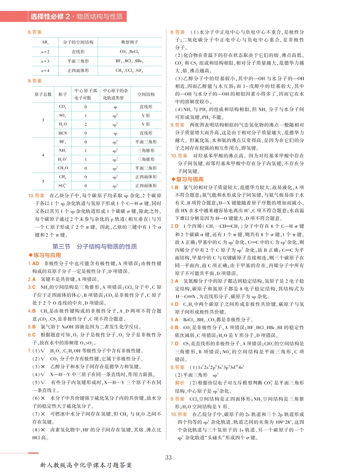 高中化学选必2教材答案(物质结构与性质)