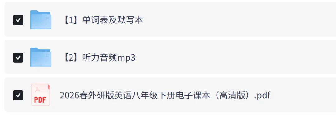 外研社版初中英语八年级下册电子课本教材+单词表+单词默写表+听力音频完整版(2026年新版教材),可下载打印!
