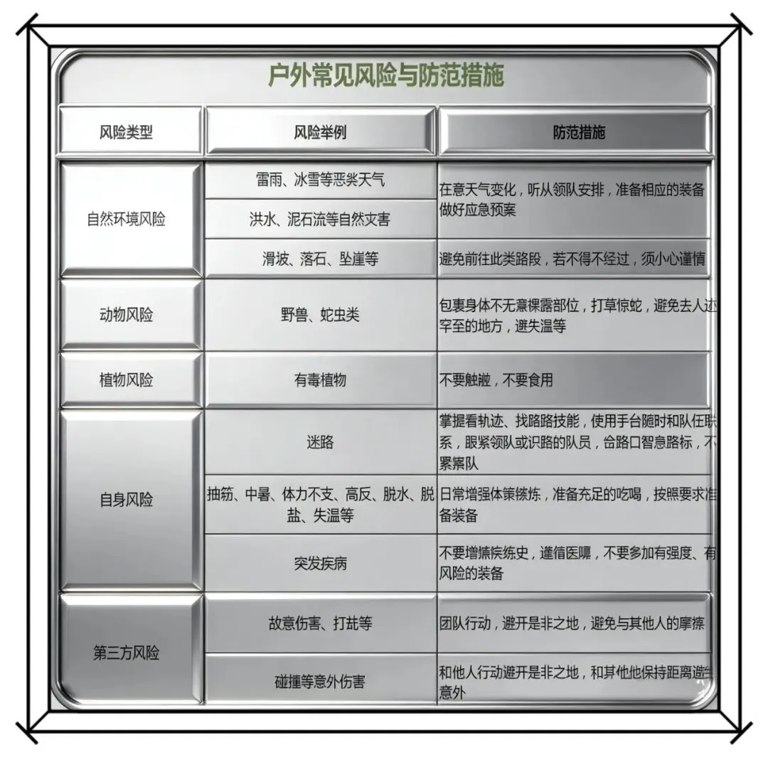 此次活动属自助出行活动,当由于意外事故,突发气候变化和急性疾病等不可预测 因素造成身体损害时,团队的发起者和同行者有义务尽力救助,但如果造成了不可逆转的损害,团队的其他成员不负担任何责任。团队的任何一名队员都应本着: “尽力救助,风险自担”原则参加这次活动,活动发起者和组织者亦不承担任何法律和经济责任