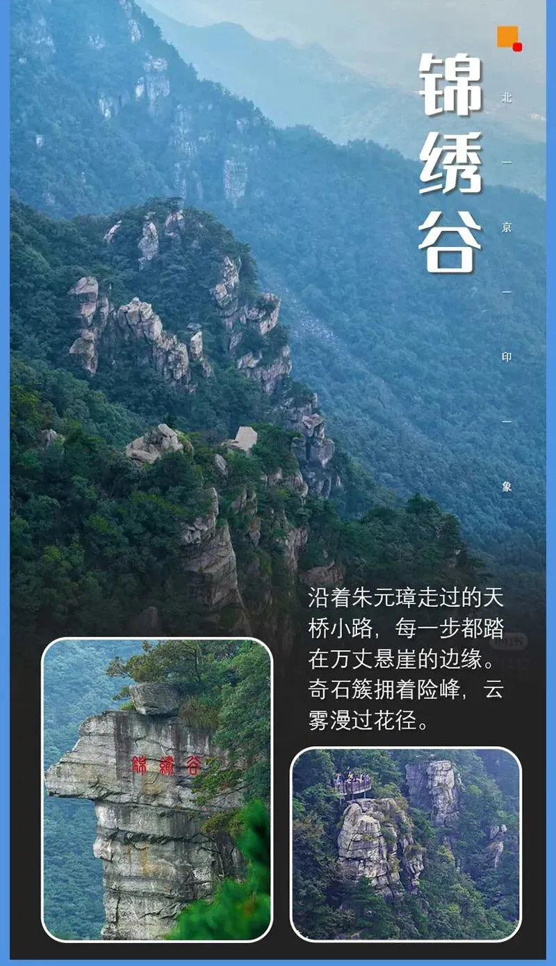 锦绣谷-仙人洞由第四纪冰川刻切形成的冰川槽谷,长约1.5公里。沿锦绣谷傍绝壁悬崖修筑的石级便道游览,可谓“路盘松顶上,穿云破雾出。走到尽头就是仙人洞,洞内现存纯阳殿、蟾蜍石、石松及“一滴泉”等景观,飞岩可栖身,清泉可洗心,俯视山外可见云海江流,摩崖石刻包括“纵览云飞”“山高水滴千秋不断”等题刻。