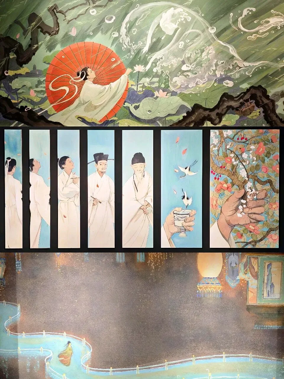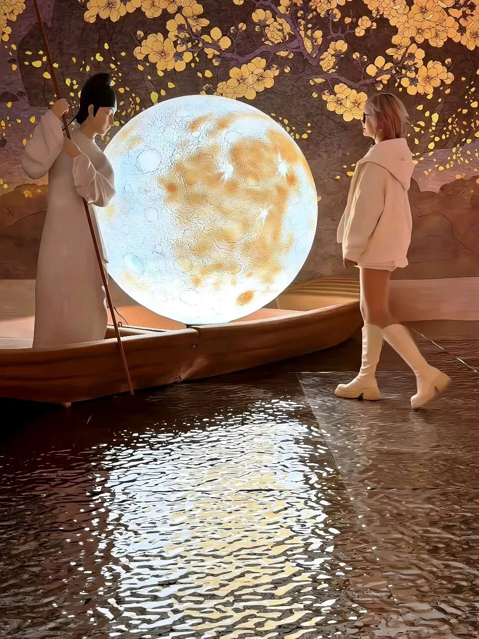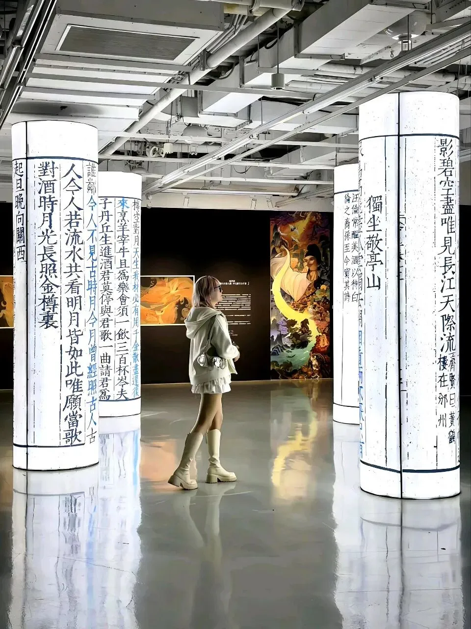 一开始听这展览的名字,以为是那种“把诗词做成网红墙”的无聊的学习展,结果整整在这个展厅里待了二个小时,上海k11举办的这场诗人展,整体体验下来,内容还挺丰富,布展也很大,每个转角的遇见都像在翻开一本会动的语文课本👇🏻入口处的《春江花月夜》装置直接暴击。巨大的圆月搁在小船上,脚下的“河水”是镜面材质,灯光一打,波光粼粼的。张若虚那首诗我上学时背得头疼,但站这儿突然懂了“滟滟随波千万里”,原来不是夸张。展览按诗人性格和人生轨迹划分了九个展区,每个区域都是独特的设计:✅️ 李白的“梦游天姥吟留别”区域,用画还原“须行即骑访名山”的洒脱感,视觉上不算华丽,但那种不羁的气息是能感受到的。✅️杜甫的区域色调暗沉,画里反复出现沙鸥的意象,对应那句“飘飘何所似,天地一沙鸥”。✅️白居易的“琵琶行”区域,做了江夜听琵琶的场景,灯光昏暗,营造出那种“同是天涯沦落人”的氛围。✅️苏轼的区有巧思,一轮明月,一个人,一杯酒,《水调歌头》被画成了月亮的阴晴圆缺,苏轼在每一轮月亮下都是不同的姿态:有时仰头,有时低头,有时举杯。✅️李清照的区域是最轻盈的,明亮的色调,投影里有秋千、荷花、溪亭日暮,还原的是《如梦令》里那个“争渡,争渡,惊起一滩鸥鹭”的少女时光。✅️辛弃疾的区域则完全不同,用了大面积的红色和山河画,呼应“何处望神州?满眼风光北固楼”的壮阔与遗憾。✅️陶渊明展区是田园风的投影,有菊花的影子和土地的颜色,简单得像他的诗。✅️柳永展区是市井画卷,画上流动着汴京街市的热闹,像古画活过来了。✅️林逋展区最有意思,画中梅花的光影飘下来,站在画前感觉自己被梅花包围了。展览里嵌了将近50首中小学课本里的诗词,不是单纯地抄在墙上,而是通过3D动画、光影装置让它们“动”起来。比如《静夜思》,你站在特定位置,真的有月光“洒”到脚边。比如《大林寺桃花》,投影动画里的的桃花会从含苞到盛开,循环往复。还有“数字诗人”的互动环节,屏幕里的诗人会像导览员一样跟你聊创作时的故事,虽然技术上不算多惊艳,但对小朋友来说确实比干看文字有意思。以前觉得李白是“诗仙”,高高在上,看完发现他也是个普通人,会郁闷,会不甘,会写诗骂人。以前觉得杜甫太苦了,背《春望》就头疼,看完“天地一沙鸥”的画,突然明白他写的不是惨,是真实。李清照不是只有“凄凄惨惨戚戚”,她也曾“争渡争渡”,也曾“和羞走”。诗词不是我们以前的考试题,而是这些古人活过的证据!地址:上海chi K11美术馆(黄浦区淮海中路300号K11购物艺术中心B3层)时间:10:00—20:00(19:30停止入场)