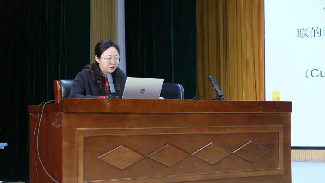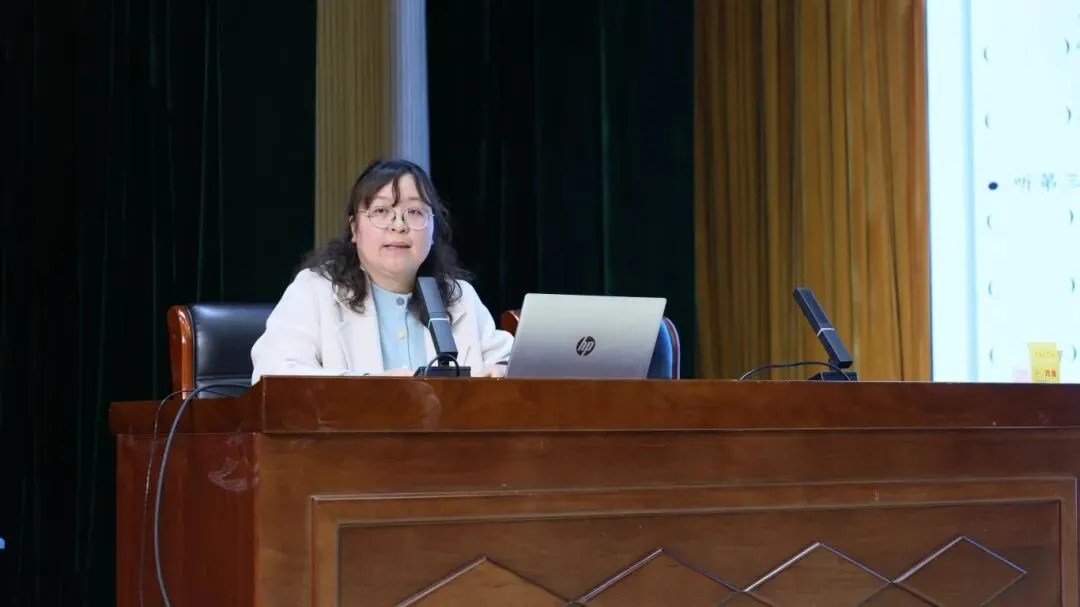 课例展示后,渡江实验小学教师刘烊羽带来专题讲座,为新教材教学精准赋能。她梳理了新教材整体框架,对比分析新旧教材单元主题与语言功能差异,明确“主题深化、语用聚焦”的核心特点,帮助教师精准把握教材编写逻辑与学段目标。同时围绕单元整体教学与问题链设计,针对语篇教学,倡导“语篇在前、意义先行”,为课堂提质增效提供了清晰可操作的实践路径。