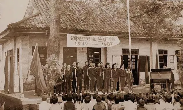 照片里的人站得很规矩,尤其第二张,孩子们在台下仰着头看,台上像是在搞校庆或活动。那时候的校园没什么花哨布置,可旗子一挂、横幅一拉、桌子一摆,仪式感一下就出来了。很多农村学校以前就是旧房子改的,有的是庙,有的是祠堂,教室没那么宽敞,冬天漏风,夏天闷热,但大家照样在里面念书、背课文、做早操。现在回头看,条件不算好,可记忆反而很深。